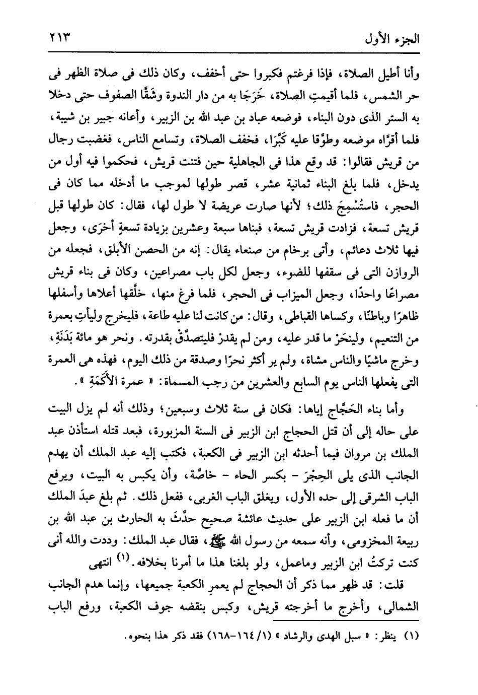 وَأَنا أطيل الصَّلَاة فَإِذا فَرَغْتُمْ فكبروا حَتَّى أخفف وَكَانَ ذَلِك فِي صَلَاة الظّهْر فِي حر الشَّمْس فَلَمَّا أُقِيمَت الصَّلَاة خرجا بِهِ من دَار الندوة وشقا الصُّفُوف حَتَّى دخلا بِهِ السّتْر الَّذِي دون الْبناء فَوَضعه عباد بن عبد الله بن الزبير وأعانه جُبَير بن شيبَة فَلَمَّا أقراه مَوْضِعه وطوقا عَلَيْهِ كبرا فَخفف الصَّلَاة وتسامع النَّاس فَغضِبت رجال من قُرَيْش فَقَالُوا قد وَقع هَذَا فِي الْجَاهِلِيَّة حِين فتنت قُرَيْش فحكموا فِيهِ أول من يدْخل فَلَمَّا بلغ الْبناء ثَمَانِيَة عشر قصر طولهَا لموجب مَا أدخلهُ مِمَّا كَانَ فِي الْحجر فاستسمج ذَلِك لِأَنَّهَا صَارَت عريضة لَا طول لَهَا فَقَالَ كَانَ طولهَا قبل قُرَيْش تِسْعَة فزادت قُرَيْش تِسْعَة فبناها سَبْعَة وَعشْرين بِزِيَادَة تِسْعَة أُخْرَى وَجعل فِيهَا ثَلَاث دعائم وأتى برخام من صنعاء يُقَال إِنَّه من الْحصن الأبلق فَجعله من الروازن الَّتِي فِي سقفها للضوء جعل لكل بَاب مصراعين وَكَانَ فِي بِنَاء قُرَيْش مصراعاً وَاحِدًا وَجعل الْمِيزَاب فِي الْحجر فَلَمَّا فرغ مِنْهَا خلقهَا أَعْلَاهَا وأسفلها ظَاهرا وَبَاطنا وَكَسَاهَا الْقبَاطِي وَقَالَ من كَانَت لنا عَلَيْهِ طَاعَة فَليخْرجْ وليأت بِعُمْرَة من التَّنْعِيم ولينحر مَا قدر عَلَيْهِ وَمن لم يقدر فليتصدق بقدرته وَنحر هُوَ مائَة بَدَنَة وَخرج مَاشِيا وَالنَّاس مشَاة وَلم ير أَكثر نحراً وَصدقَة من ذَلِك الْيَوْم فَهَذِهِ هِيَ الْعمرَة الَّتِي يَفْعَلهَا النَّاس يَوْم السَّابِع وَالْعِشْرين من رَجَب الْمُسَمَّاة عمْرَة الأكمة وَأما بِنَاء الْحجَّاج إِيَّاهَا فَكَانَ فِي سنة ثَلَاث وَسبعين وَذَلِكَ أَنه لم يزل الْبَيْت على حَاله إِلَى أَن قتل الْحجَّاج ابْن الزبير فِي السّنة الْمَذْكُورَة فَبعد قَتله اسْتَأْذن عبد الْملك بن مَرْوَان فِيمَا أحدثه ابْن الزبير فِي الْكَعْبَة فَكتب إِلَيْهِ عبد الْملك أَن يهدم الْجَانِب الَّذِي يَلِي الْحجر بِكَسْر الْحَاء خَاصَّة وَأَن يكبس بِهِ الْبَيْت وَيرْفَع الْبَاب الشَّرْقِي إِلَى حَده الأول ويغلق الْبَاب الغربي ففلعل ذَلِك ثمَّ بلغ عبد الْملك أَن مَا فعله ابْن الزبير على حَدِيث عَائِشَة صَحِيح حدث بن الْحَارِث بن عبد الله بن ربيعَة المَخْزُومِي وانه سَمعه من رَسُول الله