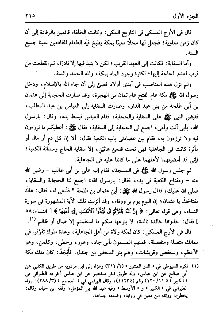 أَيْن عُثْمَان بن طَلْحَة فدعى لَهُ فَقَالَ هاك مفتاحك يَا عُثْمَان إِن الْيَوْم يَوْم بر ووفاد وَقد أنزلت تِلْكَ الْآيَة الْمَشْهُورَة فِي سُورَة النِّسَاء وَهِي قَوْله تَعَالَى {إِنَّ اللَّهَ يَأَمُرُكُمْ أَن تُؤَدُّوا الْأَمَانَات إِلَى أَهْلِهَا} النِّسَاء 58 فَقَالَ خذوها خالدة تالدة لَا يَنْزِعهَا مِنْكُم مَا اسْتَقَمْتُمْ إِلَّا ضال أَو ظَالِم قَالَ فِي الأرج المسكي كَانَ لمَكَّة وُلَاة من أهل الْجَاهِلِيَّة وعدة مُلُوك تفَرقُوا فِي ممالك مُتَّصِلَة ومنفصلة فَمنهمْ المسمون بِأبي جاد وهوز وحطي وكلمن وَهُوَ الْأَعْظَم وسعفص وقريشات وهم بَنو الْمَحْض بن جندل فأبجد كَانَ ملك مَكَّة