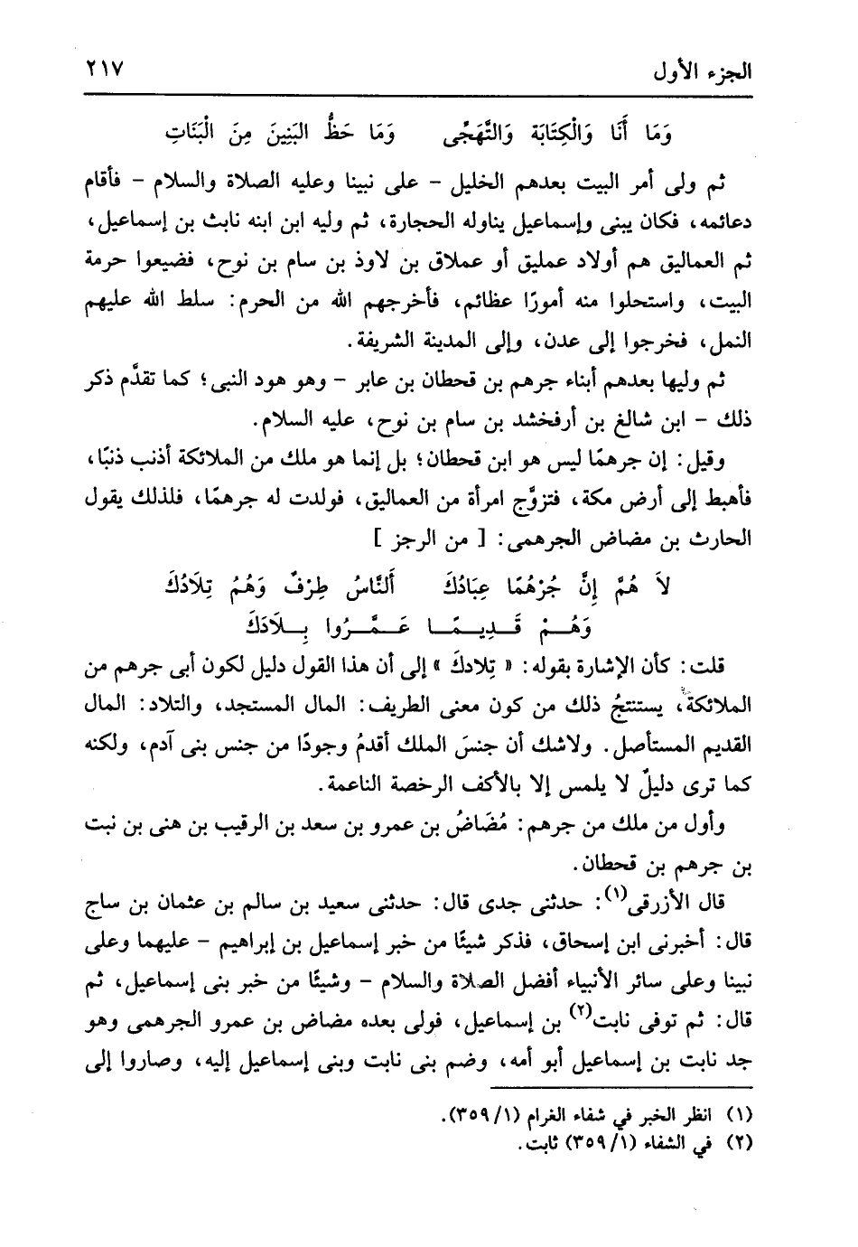 قلت كَأَن الْإِشَارَة بقوله تلادك إِلَى أَن هَذَا القَوْل دَلِيل لكَون أبي جرهم من الْمَلَائِكَة يستنتج ذَلِك من كَون معنى الطريف المَال المستجد والتلاد المَال الْقَدِيم المستأصل وَلَا شكّ أَن جنس الْملك أقدم وجودا من جنس بني آدم وَلكنه كَمَا ترى دَلِيل لَا يلمس إِلَّا بالأكف الرُّخْصَة الناعمة وَأول من ملك من جرهم مضاض بن عَمْرو بن سعد بن الرَّقِيب بن هني بن نبت بن جرهم بن قحطان قَالَ الأرزقي حَدثنِي جدي قَالَ حَدثنِي سعيد بن سَالم بن عُثْمَان بن سَاج قَالَ أَخْبرنِي ابْن إِسْحَاق فَذكر شَيْئا من خبر إِسْمَاعِيل بن إِبْرَاهِيم عَلَيْهِمَا وعَلى نَبينَا وعَلى سَائِر الْأَنْبِيَاء أفضل الصَّلَاة وَالسَّلَام وشيئاً من خبر بني إِسْمَاعِيل ثمَّ قَالَ ثمَّ توفّي نابت بن إِسْمَاعِيل فولى بعده مضاض بن عَمْرو الجرهمي وَهُوَ جد نابت بن إِسْمَاعِيل أَبُو أمه وَضم بني نابت وَبني إِسْمَاعِيل إِلَيْهِ وصاروا إِلَى