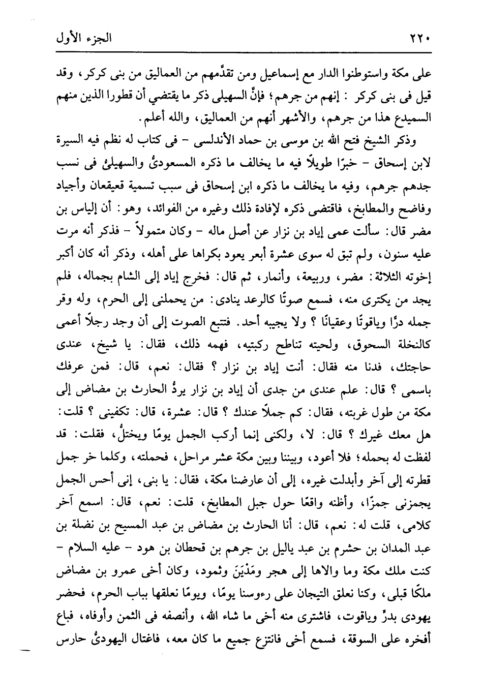 على مَكَّة واستوطنوا الدَّار مَعَ إِسْمَاعِيل وَمن تقدمهم من العماليق من بني كركر وَقد قيل فِي بني كركر إِنَّهُم من جرهم فَإِن السُّهيْلي ذكر مَا يَقْتَضِي أَن قطورا الَّذين مِنْهُم السميدع هَذَا من جرهم وَالْأَشْهر أَنهم من العماليق وَالله أعلم وَذكر الشَّيْخ فتح الله بن مُوسَى بن حَمَّاد الأندلسي فِي كتاب لَهُ نظم فِيهِ السِّيرَة لِابْنِ إِسْحَاق خَبرا طَويلا فِيهِ مَا يُخَالف مَا ذكره المَسْعُودِيّ والسهيلي فِي نسب جدهم جرهم وَفِيه مَا يُخَالف مَا ذكره ابْن إِسْحَاق فِي سَبَب تَسْمِيَة قعيقعان وأجياد وفاضح والمطابخ فَاقْتضى ذكره لإِفَادَة ذَلِك وَغَيره من الْفَوَائِد وَهُوَ أَن إلْيَاس بن مُضر قَالَ سَأَلت عمي إياد بن نزار عَن أصل مَاله وَكَانَ متمولاً فَذكر أَنه مرت عَلَيْهِ سنُون وَلم تبْق لَهُ سوى عشرَة أبعر يعود بكراها على أَهله وَذكر أَنه كَانَ ابكر اخوته الثَّلَاثَة مُضر وَرَبِيعَة وإنمار ثمَّ قَالَ فَخرج إياد إِلَى الشَّام بجماله فَلم يجد من يكتري مِنْهُ فَسمع صَوتا كالرعد يُنَادي من يحملني إِلَى الْحرم وَله وقر جمله درا وياقوتاً وعقياناً وَلَا يجِيبه أحد فتتبع الصَّوْت إِلَى ان وجد رجلا أعمى كالنخلة السحوق ولحيته تناطح رُكْبَتَيْهِ فهمه ذَلِك فَقَالَ يَا شيخ عِنْدِي حَاجَتك فَدَنَا مِنْهُ فَقَالَ أَنْت اياد بن نزار فَقَالَ نعم قَالَ فَمن عرفك باسمي قَالَ علم عِنْدِي من جدي إِن إياد بن نزار يرد الْحَارِث بن مضاض إِلَى مَكَّة من طول غربته فَقَالَ كم جملا عنْدك قَالَ عشرَة قَالَ تكفيني قلت هَل مَعَك غَيْرك قَالَ لَا وَلَكِنِّي إِنَّمَا أركب الْجمل يَوْمًا ويختل فَقلت قد لفظت لَهُ بِحمْلِهِ فَلَا أَعُود وبيننا وَبَين مَكَّة عشر مراحل فَحَملته وَكلما خر جمل قطرته إِلَى آخر وأبدلت غَيره إِلَى أَن عَارَضنَا مَكَّة فَقَالَ يَا بني إِنِّي أحس الْجمل يجمزني جمزاً وَأَظنهُ وَاقعا حول جبل المطابخ قلت نعم قَالَ اسْمَع آخر كَلَامي قلت لَهُ نعم قَالَ أَنا الْحَارِث بن مضاض بن عبد الْمَسِيح بن نَضْلَة بن عبد المدان بن حشرم بن عبد ياليل بن جرهم بن قحطان بن هود عَلَيْهِ السَّلَام كنت ملك مَكَّة وَمَا والاها إِلَى هجر ومدين وَثَمُود وَكَانَ أخي عَمْرو بن مضاض ملكا قبلي وَكُنَّا نعلق التيجان على رءوسنا يَوْمًا وَيَوْما نعلقها بِبَاب الْحرم فَحَضَرَ يَهُودِيّ بدر وَيَاقُوت فَاشْترى مِنْهُ أخي مَا شَاءَ الله وأنصفه فِي الثّمن وأوفاه فَبَاعَ أفخره على السوقة فَسمع أخي فَانْتزع جَمِيع مَا كَانَ مَعَه فاغتال الْيَهُودِيّ حارس