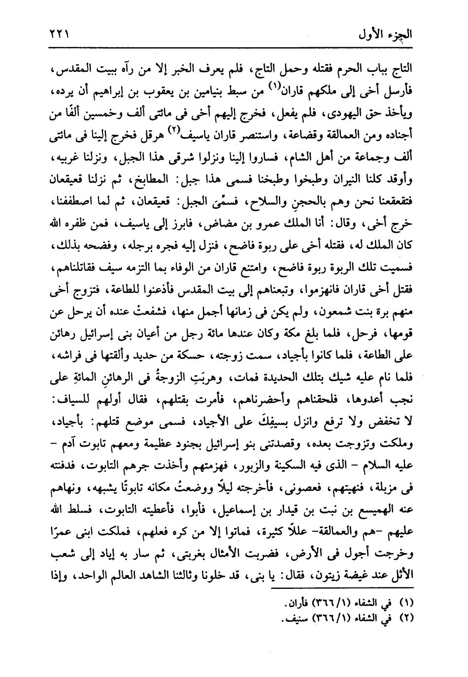 التَّاج بِبَاب الْحرم فَقتله وَحمل التَّاج فَلم يعرف الْخَبَر إِلَّا من رَآهُ بِبَيْت الْمُقَدّس فَأرْسل أخي إِلَى ملكهم قاران من سبط بنيامين بن يَعْقُوب بن إِبْرَاهِيم أَن يردهُ وَيَأْخُذ حق الْيَهُودِيّ فَلم يفعل فَخرج إِلَيْهِم أخي فِي مِائَتي ألف وَخمسين ألفا من اجناده وَمن العمالقة وقضاعة واستنصر قاران ياسيف هِرقل فَخرج إِلَيْنَا فِي مِائَتي ألف وَجَمَاعَة من أهل الشَّام فَسَارُوا إِلَيْنَا ونزلوا شَرْقي هَذَا الْجَبَل ونزلنا غَرِيبه وأوقد كلنا النيرَان وطبخوا وطبخنا فَسمى هَذَا جبل المطابخ ثمَّ نزلنَا قعيقعان فتقعقعنا نَحن وهم بالحجن وَالسِّلَاح فَسمى الْجَبَل قعيقعان ثمَّ لما اصطففنا خرج أخي وَقَالَ أَنا الْملك عَمْرو بن مضاض فابرز إِلَى ياسيف فَمن ظفره الله كَانَ الْملك لَهُ فَقتله أخي على ربوة فاضح فَنزل إِلَيْهِ فجره بِرجلِهِ وفضحه بذلك فسميت تِلْكَ الربوة ربوة فاضح وَامْتنع قاران من الْوَفَاء بِمَا الْتَزمهُ سيف فقاتلناهم فَقتل أخي قاران فَانْهَزَمُوا وتبعناهم إِلَى بَيت الْمُقَدّس فأذعنوا للطاعة فَتزَوج أخي مِنْهُم برة بنت شَمْعُون وَلم يكن فِي زمانها أجمل مِنْهَا فشفعت عِنْده أَن يرحل عَن قَومهَا فَرَحل فَلَمَّا بلغ مَكَّة وَكَانَ عِنْدهَا مائَة رجل من أَعْيَان بني إِسْرَائِيل رهائن على الطَّاعَة فَلَمَّا كَانُوا بأجياد سمت زَوجته حسكة من حَدِيد وألقتها فِي فرَاشه فَلَمَّا نَام عَلَيْهِ شيك بِتِلْكَ الحديدة فَمَاتَ وهربت الزَّوْجَة فِي الرهائن الْمِائَة على نجب أعدوها فلحقناهم وأحضرناهم فَأمرت بِقَتْلِهِم فَقَالَ أَوَّلهمْ للسياف لَا تخْفض وَلَا ترفع وَانْزِلْ بسيفك على الأجياد فَسمى مَوضِع قَتلهمْ بأجياد وملكت وَتَزَوَّجت بعده وقصدتني بَنو إِسْرَائِيل بِجُنُود عَظِيمَة وَمَعَهُمْ تَابُوت آدم عَلَيْهِ السَّلَام الَّذِي فِيهِ السكينَة وَالزَّبُور فهزمتهم وَأخذت جرهم التابوت فدفنته فِي مزبلة فنهيتهم فعصوني فَأَخْرَجته لَيْلًا وَوضعت مَكَانَهُ تابوتا يُشبههُ ونهاهم عَنهُ الهميع بن نبت بن قيدار بن إِسْمَاعِيل فَأَبَوا فاعطيته التابوب فَسلط الله عَلَيْهِم هم والعمالقة عللاً كَثِيرَة فماتوا إِلَّا من كره فعهلم فملكت ابْني عمرا وَخرجت أجول فِي الأَرْض فَضربت الْأَمْثَال بغربتي ثمَّ سَار بِهِ إياد إِلَى شعب الأثل عِنْد غيضة زيتون فَقَالَ يَا بني قد خلونا وثالثنا الشَّاهِد الْعَالم الْوَاحِد وَإِذا