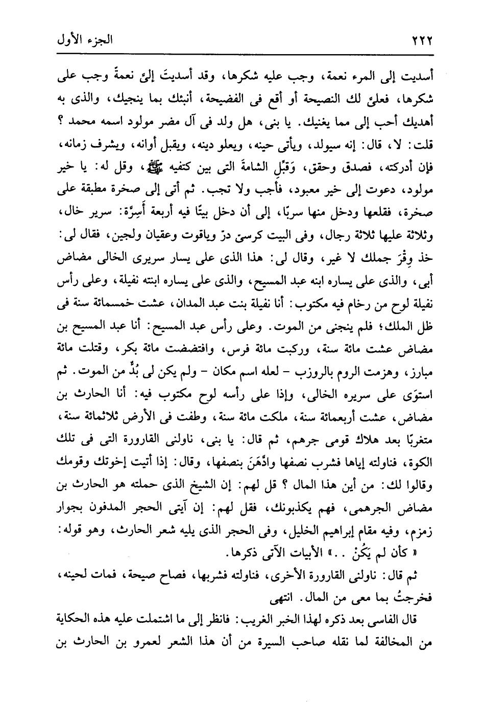 وَقل لَهُ يَا خير مَوْلُود دَعَوْت إِلَى خير معبود فأجب وَلَا تجب ثمَّ أَتَى إِلَى صَخْرَة مطبقة على صَخْرَة فقلعها وَدخل مِنْهَا سرباً إِلَى أَن دخل بَيْتا فِيهِ أَرْبَعَة أسرة سَرِير خَال وَثَلَاثَة عَلَيْهَا ثَلَاثَة رجال وَفِي الْبَيْت كرْسِي در وَيَاقُوت وعقيان ولجين فَقَالَ لي خُذ وقر جملك لَا غير وَقَالَ لي هَذَا الَّذِي على يسَار سَرِيرِي الْخَالِي مضاض أبي وَالَّذِي على يسَاره ابْنه عبد الْمَسِيح وَالَّذِي على يسَاره ابْنَته نفيلة وعَلى رَأس نفيلة لوح من رُخَام فِيهِ مَكْتُوب أَنا نفيلة بنت عبد المدان عِشْت خَمْسمِائَة سنة فِي ظلّ الْملك فَلم يُنجنِي من الْمَوْت وعَلى رَأس عبد الْمَسِيح أَنا عبد الْمَسِيح بن مضاض عِشْت مائَة سنة وَركبت مائَة فرس وافتضضت مائَة بكر وَقتلت مائَة مبارز وهزمت الرّوم بالروزب لَعَلَّه اسْم مَكَان وَلم يكن لي بُد من الْمَوْت ثمَّ اسْتَوَى على سَرِيره الْخَالِي وَذَا على رَأسه لوح مَكْتُوب فِيهِ أَنا الْحَارِث بن مضاض عِشْت أَرْبَعمِائَة سنة ملكت مائَة سنة وطفت فِي الأَرْض ثَلَاثمِائَة سنة متغرباً بعد هَلَاك قومِي جرهم ثمَّ قَالَ يَا بني ناولني القارورة الَّتِي فِي تِلْكَ الكوة فناولته إِيَّاهَا فَشرب نصفهَا وادهن بِنِصْفِهَا وَقَالَ إِذا أتيت إخْوَتك وقومك وَقَالُوا لَك من أَيْن هَذَا المَال قل لَهُم إِن الشَّيْخ الَّذِي حَملته هُوَ الْحَارِث بن مضاض الجرهمي فهم يكذبُونَك فَقل لَهُم إِن آيتي الْحجر المدفون بجوار زَمْزَم وَفِيه مقَام إِبْرَاهِيم الْخَلِيل وَفِي الْحجر الَّذِي يَلِيهِ شعر الْحَارِث وَهُوَ قَوْله كَأَن لم يكن الأبيات الْآتِي ذكرهَا ثمَّ قَالَ ناولني القارورة الْأُخْرَى فناولته فَشربهَا فصاح صَيْحَة فَمَاتَ لحينه فَخرجت بِمَا معي من المَال انْتهى قَالَ الفاسي بعد ذكره لهَذَا الْخَبَر الغربيب فَانْظُر إِلَى مَا اشْتَمَلت عَلَيْهِ هَذِه الْحِكَايَة من الْمُخَالفَة لما نَقله صَاحب السِّيرَة من أَن هَذَا الشّعْر لعَمْرو بن الْحَارِث بن