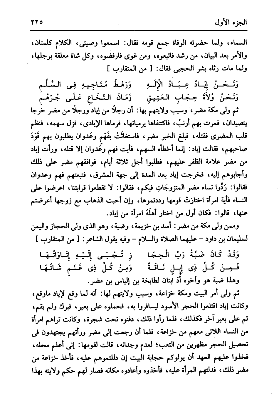 ثمَّ ولي مَكَّة مُضر وَسبب ولايتهم بهَا أَن رجلا من إياد ورجلاً من مُضر خرجا يتصيدان فمرت بهم أرنب فاكتنفاها يرميانها فَرَمَاهَا الْإِيَادِي فزل سَهْمه فنظم قلب المضري فَقتله فَبلغ الْخَبَر مُضر فاستغاثت بفهم وعدوان يطْلبُونَ بهم قَود صَاحبهمْ فَقَالَت اياد إِنَّمَا اخطأه السهْم فَأَبت فهم وعدوان إِلَّا قَتله وَرَأَتْ إياد من مُضر عَلامَة الظفر عَلَيْهِم فطلبوا أجل ثَلَاثَة أَيَّام فوافقهم مُضر على ذَلِك وأجابوهم إِلَيْهِ فَخرجت إياد بعد الْمدَّة إِلَى جِهَة الْمشرق فتبعتهم فهم وعدوان فَقَالُوا ردوا نسَاء مُضر المتزوجات فِيكُم فَقَالُوا لَا تقطعوا قرابتنا اعرضوا على النِّسَاء فأية امْرَأَة اخْتَارَتْ قَومهَا رددتموها وَإِن أحبت الذّهاب مَعَ زَوجهَا أعرضتم عَنْهَا قَالُوا فَكَانَ أول من اخْتَار أَهله امْرَأَة من إياد وَمِمَّنْ ولي مَكَّة من مُضر أَسد بن خُزَيْمَة وضبة وَهُوَ الَّذِي ولي الْحجاز واليمن لِسُلَيْمَان بن دَاوُد عَلَيْهِمَا الصَّلَاة وَالسَّلَام وَفِيه يَقُول الشَّاعِر // (من المتقارب) //
