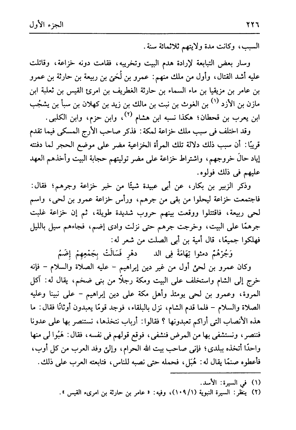 وَكَانَ عَمْرو بن لحي أول من غير دين إِبْرَاهِيم عَلَيْهِ الصَّلَاة وَالسَّلَام فَإِنَّهُ خرج إِلَى الشَّام واستخلف على الْبَيْت وَمَكَّة رجلا من بني ضخم يُقَال لَهُ آكل الْمَرْوَة وَعَمْرو بن لحي يَوْمئِذٍ وَأهل مَكَّة على دين إِبْرَاهِيم على نَبينَا وَعَلِيهِ الصَّلَاة وَالسَّلَام فَلَمَّا قدم الشَّام نزل بالبلقاء فَوجدَ قوما يعْبدُونَ اوثاثنا فَقَالَ مَا هَذِه الأنصاب الَّتِي أَرَاكُم تعبدونها فَقَالُوا أَرْبَاب نتخذها نستنصر بهَا على عدونا فننصر ونستشفى بهَا من الْمَرَض فنشفى فَوَقع قَوْلهم فِي نَفسه فَقَالَ هبوا لي مِنْهَا وَاحِدًا أتخذه ببلدي فَإِنِّي صَاحب بَيت الله الْحَرَام وإلي وَفد الْعَرَب من كل أَوب فَأَعْطوهُ صنماً يُقَال لَهُ هُبل فَحَمله حَتَّى نَصبه للنَّاس فتابعته الْعَرَب على ذَلِك