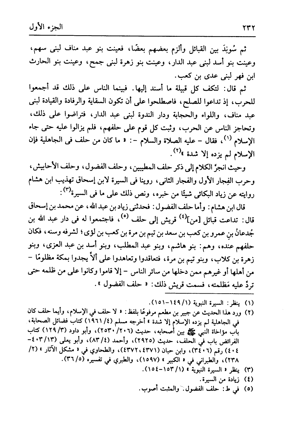 ثمَّ سوند بَين الْقَبَائِل وألزم بَعضهم بَعْضًا فعينت بَنو عبد منَاف لبني سهم وعينت بَنو أَسد لبني عبد الدَّار وعينت بَنو زهرَة لبني جمح وعينت بَنو الْحَارِث ابْن فهر لبني عدي بن كَعْب ثمَّ قَالَ لتكف كل قَبيلَة مَا أسْند إِلَيْهَا فَبَيْنَمَا النَّاس على ذَلِك قد أَجمعُوا للحرب إِذْ تداعوا للصلح فَاصْطَلَحُوا على أَن تكون السِّقَايَة والرفادة والقيادة لبني عبد منَاف واللواء والحجابة وَدَار الندوة لبني عبد الدَّار فتراضوا على ذَلِك وتحاجز النَّاس عَن الْحَرْب وَثَبت كل قوم على حلفهم فَلم يزَالُوا عَلَيْهِ حَتَّى جَاءَ الْإِسْلَام فَقَالَ عَلَيْهِ الصَّلَاة وَالسَّلَام مَا كَانَ من حلف فِي الجالهية فَإِن الْإِسْلَام لم يزده إِلَّا شدَّة وَحَيْثُ انجر الْكَلَام إِلَى ذكر حلف المطيبين وَحلف الفضول وَحلف الْأَحَابِيش وَحرب الْفجار الأول والفجار الثَّانِي روينَا فِي السِّيرَة لِابْنِ إِسْحَاق تَهْذِيب ابْن هِشَام رِوَايَته عَن زِيَاد البكائي شَيْئا من خَبره وَنَصّ ذَلِك على مَا فِي السِّيرَة قَالَ ابْن هَاشم وَأما حلف الفضول فَحَدثني زِيَاد بن عبد الله عَن مُحَمَّد بن إِسْحَاق قَالَ تداعت قبائل من قُرَيْش إِلَى حلف فَاجْتمعُوا لَهُ فِي دَار عبد الله بن جدعَان بن عَمْرو بن كَعْب بن سعد بن تيم بن مرّة بن كَعْب بن لؤَي لشرفه وسنه فَكَانَ حلفهم عِنْده وهم بَنو هَاشم وَبَنُو عبد الْمطلب وَبَنُو أَسد بن عبد الْعُزَّى وَبَنُو زهرَة بن كلاب وَبَنُو تيم بن مرّة فتعاقدوا وتعاهدوا على أَلا يَجدوا بِمَكَّة مَظْلُوما من أَهلهَا أَو غَيرهم مِمَّن دَخلهَا من سَائِر النَّاس إِلَّا قَامُوا وَكَانُوا على من ظلمه حَتَّى ترد عَلَيْهِ مظلمته فَسَمت قُرَيْش ذَلِك حلف الفضول