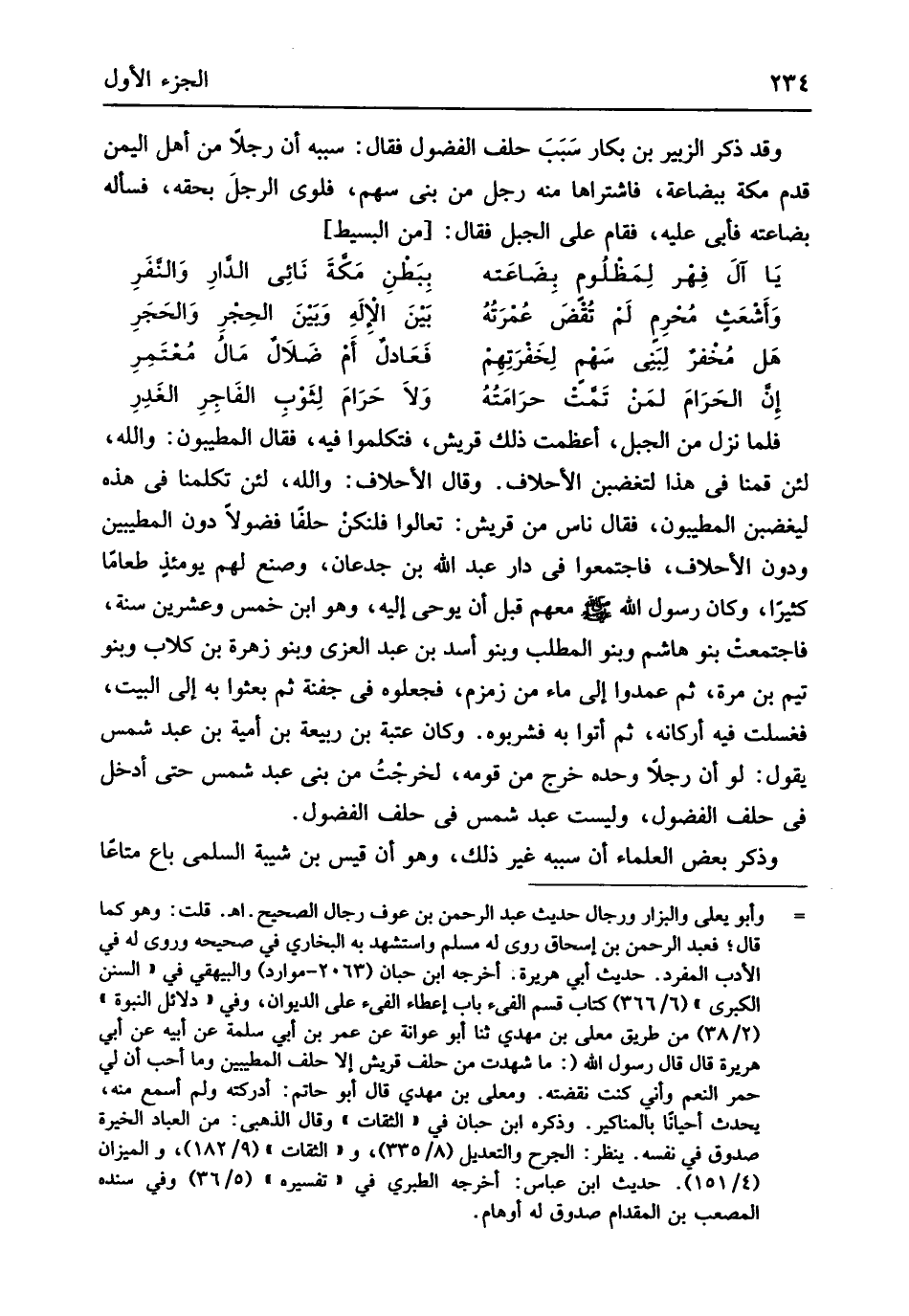 وَقد ذكر الزبير بن بكار سَبَب حلف الفضول فَقَالَ سَببه أَن رجلا من أهل الْيمن قدم مَكَّة ببضاعة فاشتراها مِنْهُ رجل من بني سهم فَلوى الرجل بِحقِّهِ فَسَأَلَهُ بضاعته فَأبى عَلَيْهِ فَقَامَ على الْجَبَل فَقَالَ // (من الْبَسِيط) //