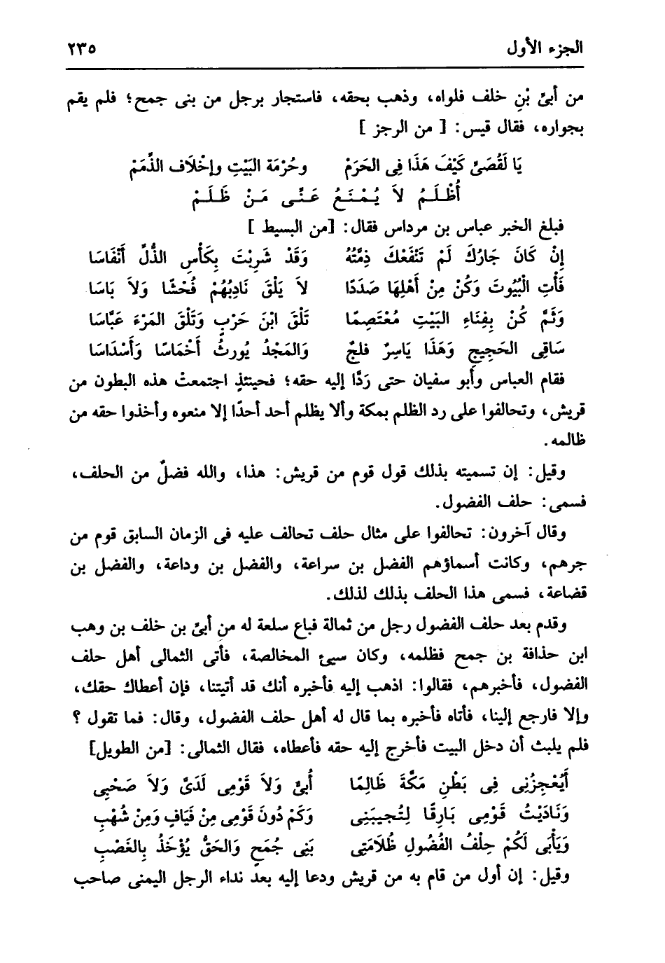 فَقَامَ الْعَبَّاس وَأَبُو سُفْيَان حَتَّى ردا إِلَيْهِ حَقه فَحِينَئِذٍ اجْتمعت هَذِه الْبُطُون من قُرَيْش وتحالفوا على رد الظُّلم بِمَكَّة والا يظلم أحدا أحدا إِلَّا منعُوهُ وَأخذُوا حَقه من ظالمه وَقيل إِن تَسْمِيَته بذلك قَول قوم من قُرَيْش هَذَا وَالله فضل من الْحلف فَسمى حلف الفضول وَقَالَ آخَرُونَ تحالفوا على مِثَال حلف تحالف عَلَيْهِ فِي الزَّمَان السَّابِق قوم من جرهم وَكَانَت أَسمَاؤُهُم الْفضل بن سراعة وَالْفضل بن ودَاعَة وَالْفضل بن قضاعة فَسمى هَذَا الْحلف بذلك لذَلِك وَقدم بعد حلف الفضول رجل من ثمالة فَبَاعَ سلْعَة لَهُ من أبي بن خلف بن وهب ابْن حذاقة بن جمح فظلمه وَكَانَ سيء المخالصة فَأتى الثمالى أهل حلف الفضول فَأخْبرهُم فَقَالُوا اذْهَبْ إِلَيْهِ فَأخْبرهُ أَنَّك قد أَتَيْتنَا فَإِن أَعْطَاك حَقك وَإِلَّا فَارْجِع إِلَيْنَا فَأَتَاهُ فَأخْبرهُ بِمَا قَالَ لَهُ أهل حلف الفضول وَقَالَ فَمَا تَقول فَلم يلبث أَن دخل الْبَيْت فَأخْرج إِلَيْهِ حَقه فَأعْطَاهُ فَقَالَ الثمالى // (من الطَّوِيل) //