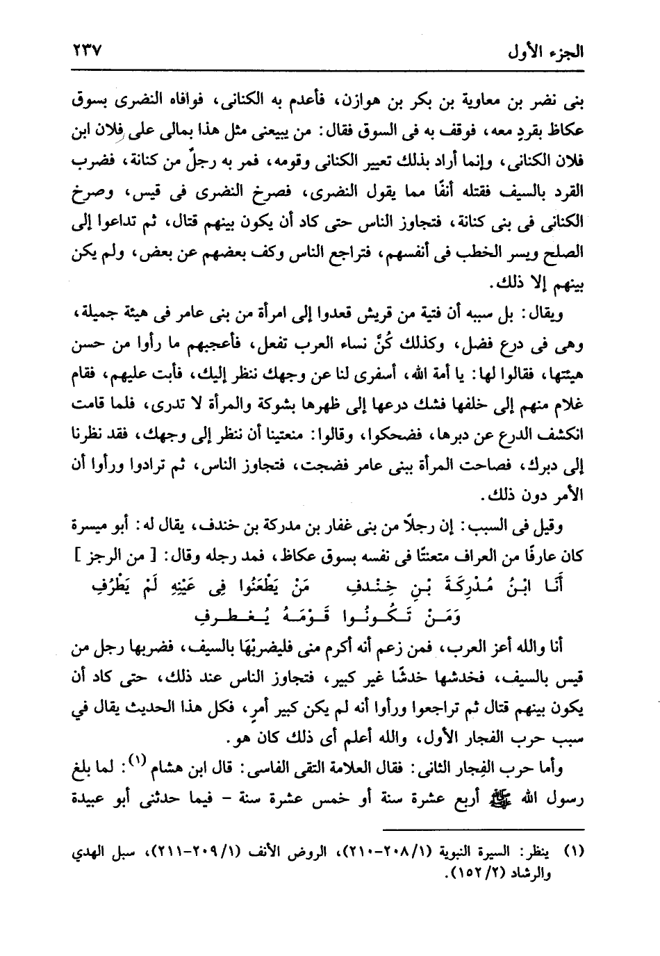بني نضر بن مُعَاوِيَة بن بكر بن هوَازن فأعدم بِهِ الْكِنَانِي فوافاه النضري بسوق عكاظ بقرد مَعَه فَوقف بِهِ فِي السُّوق فَقَالَ من يبيعني مثل هَذَا بِمَالي على فلَان ابْن فلَان الْكِنَانِي وَإِنَّمَا اراد بذلك تَعْبِير الْكِنَانِي وَقَومه فَمر بِهِ رجل من كنَانَة فَضرب القرد بِالسَّيْفِ فَقتله أنفًا مِمَّا يَقُول النضرى فَصَرَخَ النضري فِي قيس وصرخ الْكِنَانِي فِي بني كنَانَة فَتَجَاوز النَّاس حَتَّى كَاد أَن يكون بَينهم قتال ثمَّ تداعوا إِلَى الصُّلْح وَيسر الْخطب فِي أنفسهم فتراجع النَّاس وكف بَعضهم عَن بعض وَلم يكن بَينهم إِلَّا ذَلِك وَيُقَال بل سَببه أَن فتية من قُرَيْش قعدوا إِلَى امْرَأَة من بني عَامر فِي هَيْئَة جميلَة وَهِي فِي درع فضل وَكَذَلِكَ كن نسَاء الْعَرَب تفعل فَأَعْجَبَهُمْ مَا رَأَوْا من حسن هيئتها فَقَالُوا لَهَا يَا أمة الله أسفري لنا عَن وَجهك نَنْظُر إِلَيْك فابت عَلَيْهِم فَقَامَ غُلَام مِنْهُم إِلَى خلفهَا فَشك درعها إِلَى ظهرهَا بشوكة وَالْمَرْأَة لَا تَدْرِي فَلَمَّا قَامَت انْكَشَفَ الدرْع عَن دبرهَا فضحكوا وَقَالُوا منعتينا أَن نَنْظُر إِلَى وَجهك فقد نَظرنَا إِلَى دبرك فصاحت الْمَرْأَة ببني عَامر فضجت فَتَجَاوز النَّاس ثمَّ ترادوا وَرَأَوا أَن الْأَمر دون ذَلِك وَقيل فِي السَّبَب إِن رجلا من بني غفار بن مدركة بن خندف يُقَال لَهُ أَبُو ميسرَة كَانَ عَارِفًا من العراف مُتَعَنتًا فِي نَفسه بسوق عكاظ فَمد رجله وَقَالَ // (من الرجز) //