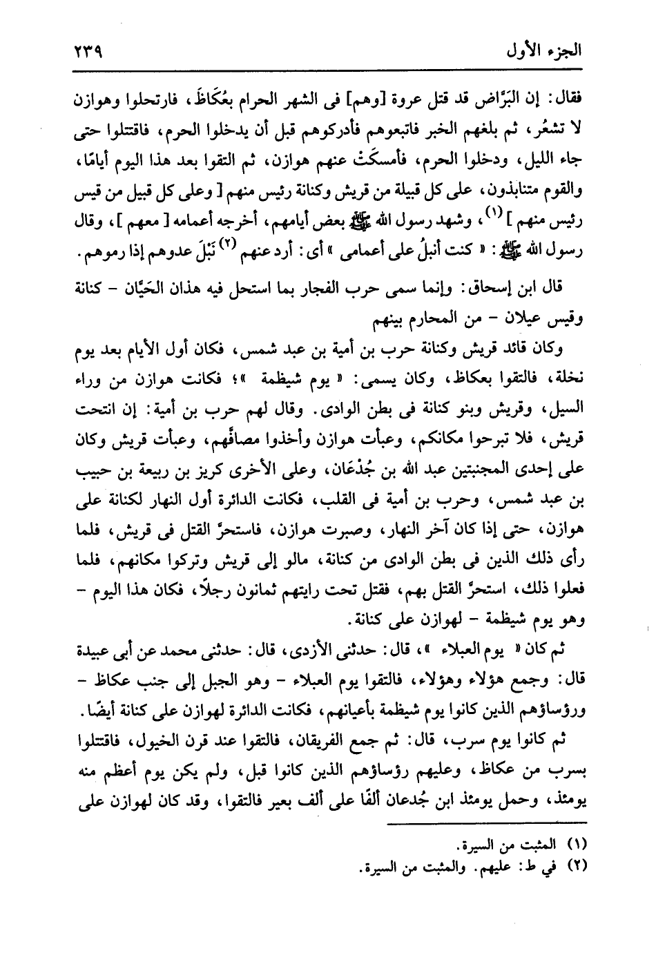كنت أنبل على أعمامي أَي أرد عَنْهُم نبل عدوهم إِذا رموهم قَالَ ابْن إِسْحَاق وَإِنَّمَا سمى حَرْب الْفجار بِمَا اسْتحلَّ فِيهِ هَذَانِ الْحَيَّانِ كنَانَة وَقيس عيلان من الْمَحَارِم بَينهمَا وَكَانَ قَائِد قُرَيْش وكنانة حَرْب بن أُميَّة بن عبد شمس فَكَانَ أول الْأَيَّام بعد يَوْم نَخْلَة فالتقو بعكاظ وَكَانَ يُسمى يَوْم شيظمة فَكَانَت هوَازن من وَرَاء السَّيْل وقريش وَبَنُو كنَانَة فِي بطن الْوَادي وَقَالَ لَهُم حَرْب بن أُميَّة إِن انتحت قُرَيْش فَلَا تَبْرَحُوا مَكَانكُمْ وعبأت هوَازن وَأخذُوا مَصَافهمْ وعبأت قُرَيْش وَكَانَ على إِحْدَى المجنبتين عبد الله بن جدعَان وعَلى الْأُخْرَى كريز بن ربيعَة بن حبيب بن عبد شمس وَحرب بن أُميَّة فِي الْقلب فَكَانَت الدائرة أول النَّهَار لكنانة على هوَازن حَتَّى إِذا كَانَ آخر النَّهَار وَصَبَرت هوَازن فاستحر الْقَتْل فِي قُرَيْش فَلَمَّا رأى ذَلِك الَّذين قي بطن الْوَادي من كنَانَة مالوا إِلَى قُرَيْش وَتركُوا مكانهم فَلَمَّا فعلو ذَلِك استحر الْقَتْل بهم فَقتل تَحت رايتهم ثَمَانُون رجلا فَكَانَ هَذَا الْيَوْم وَهُوَ يَوْم شيظمة لهوازن على كنَانَة ثمَّ كَانَ يَوْم العبلاء قَالَ حَدثنِي الْأَزْدِيّ قَالَ حَدثنِي مُحَمَّد عَن أبي عُبَيْدَة قَالَ وَجمع هَؤُلَاءِ وَهَؤُلَاء فَالْتَقوا يَوْم العبلاء وَهُوَ الْجَبَل إِلَى جنب عكاظ ورؤساؤهم الَّذين كَانُوا يَوْم شيظمة بأعيانهم فَكَانَت الدائرة لهوازن على كنَانَة أَيْضا ثمَّ كَانُوا يَوْم سرب قَالَ ثمَّ جمع الْفَرِيقَانِ فَالْتَقوا عِنْد قرن الْخُيُول فَاقْتَتلُوا بسرب من عكاظ وعلهيم رؤساؤهم الَّذِي كَانُوا قبل وَلم يكن يَوْم أعظم مِنْهُ يَوْمئِذٍ وَحمل يَوْمئِذٍ ابْن جدعَان ألفا على ألف بعير فَالْتَقوا وَقد كَانَ لهوازن على