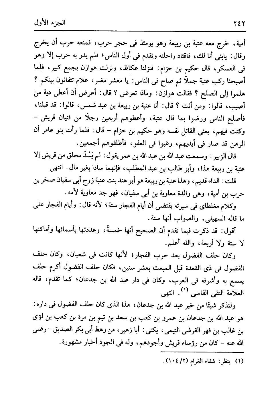 أُميَّة خرج مَعَه عتبَة بن ربيعَة وَهُوَ يَوْمئِذٍ فِي حجر حَرْب فَمَنعه حَرْب أَن يخرج وَقَالَ يَا بني أَنا لَك فاقتاد رَاحِلَته وَتقدم فِي أول النَّاس فَلم يدر بِهِ حَرْب إِلَّا وَهُوَ فِي الْعَسْكَر قَالَ حَكِيم بن حزَام فنزلنا عكاظ وَنزلت هوَازن بِجمع كَبِير فَلَمَّا أَصْبَحْنَا ركب عتبَة جملا ثمَّ صَاح فِي النَّاس يَا معشر مُضر علام تتفانون بَيْنكُم هلموا إِلَى الصُّلْح فَقَالَت هوَازن وماذا تعرض قَالَ أعرض أَن أعطي دِيَة من أُصِيب قَالُوا وَمن أَنْت قَالَ أَنا عتبَة بن ربيعَة بن عبد شمس قالو قد قبلنَا فَأصْلح النَّاس وَرَضوا بِمَا قَالَ عتبَة وأعطوهم أَرْبَعِينَ رجلا من فتيَان قُرَيْش وَكنت فيهم يَعْنِي الْقَائِل نَفسه وَهُوَ حَكِيم بن حزَام قَالَ فَلَمَّا رَأَتْ بَنو عَامر أَن الرَّهْن قد صَار فِي أَيْديهم رَغِبُوا فِي الْعَفو فأطلقوهم أَجْمَعِينَ قَالَ الزبير وَسمعت عبد الله بن عبد الله بن عمر يَقُول لم يسد محلق من قُرَيْش إِلَّا عتبَة بن ربيعَة هَذَا وَأَبُو طَالب بن عبد الْمطلب فَإِنَّهُمَا سَادًّا بِغَيْر مَال انْتهى قلت الدَّاء قديم وَهَذَا عتبَة بن ربيعَة هُوَ أَبُو هِنْد بن عتبَة زوج أبي سُفْيَان صَخْر بن حَرْب بن أُميَّة وَهِي وَالِدَة مُعَاوِيَة بن أبي سُفْيَان فَهُوَ جد مُعَاوِيَة لأمه وَكَلَام مغلطاي فِي سيرته يَقْتَضِي أَن أَيَّام الْفجار سِتَّة لِأَنَّهُ قَالَ وَأَيَّام الْفجار على مَا قَالَه السُّهيْلي وَالصَّوَاب أَنه سِتَّة أَقُول قد ذكرت فِيمَا تقدم أَن الصَّحِيح أَنَّهَا خَمْسَة وعددتها بأسمائها وأماكنها لَا سِتَّة وَلَا أَرْبَعَة وَالله أعلم وَكَانَ حلف الفضول بعد حَرْب الْفجار لِأَنَّهَا كَانَت فِي شعْبَان وَكَانَ حلف الفضول فِي ذِي الْقعدَة قبل المبعث بِعشر سِنِين فَكَانَ حلف الفضول أكْرم حلف يسمع بِهِ وأشرفه فِي الْعَرَب وَكَانَ فِي دَار عبد الله بن جدعَان كَمَا تقدم قَالَه الْعَلامَة التقي الفاسي انْتهى ولنذكر شَيْئا من خبر عبد الله بن جدعَان هَذَا الَّذِي كَانَ حلف الفضول فِي دَاره هُوَ عبد الله بن جدعَان بن عَمْرو بن كَعْب بن سعد بن تيم بن مرّة بن كَعْب بن لؤَي بن غَالب بن فهر الْقرشِي التَّيْمِيّ يكنى أَبَا زُهَيْر من رَهْط أبي بكر الصّديق رَضِي الله عَنهُ كَانَ من رُؤَسَاء قُرَيْش وأجودهم وَله فِي الْجُود أَخْبَار مَشْهُورَة
