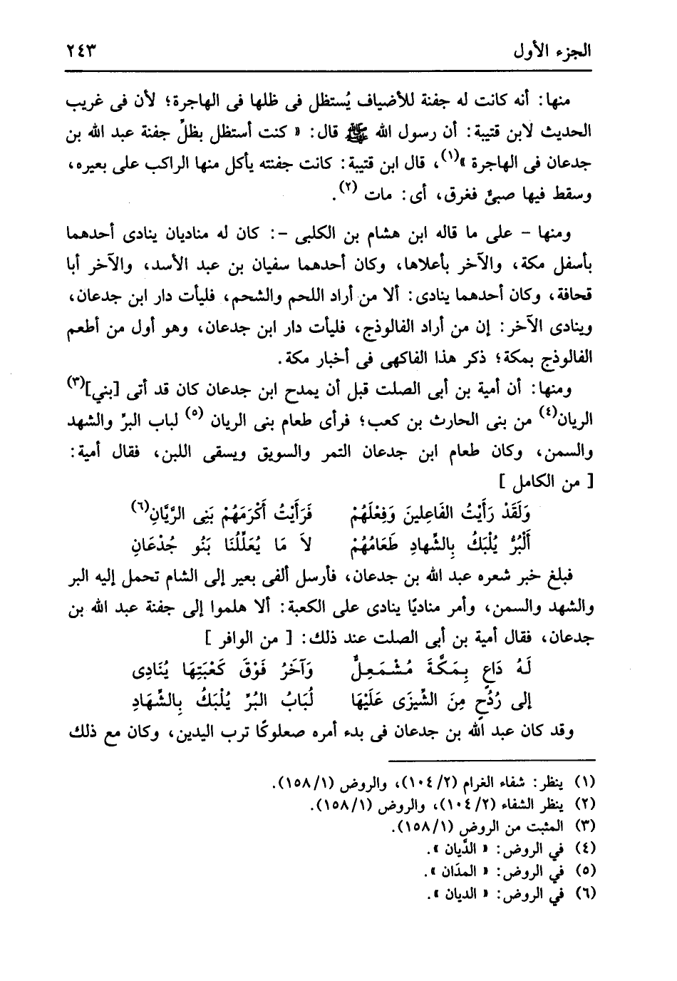 قَالَ كنت أستظل بِظِل جَفْنَة عبد الله بن جدعَان فِي الهاجرة قَالَ ابْن قُتَيْبَة كَانَت جفنته يَأْكُل مِنْهَا الرَّاكِب على بعيره وَسقط فِيهَا صبي فغرق أَي مَاتَ وَمِنْهَا على مَا قَالَه ابْن هِشَام بن الْكَلْبِيّ كَانَ لَهُ مناديان يُنَادي أَحدهمَا بِأَسْفَل مَكَّة وَالْآخر بِأَعْلَاهَا وَكَانَ أَحدهمَا سُفْيَان بن عبد الْأسد وَالْآخر أَبَا قُحَافَة وَكَانَ أَحدهمَا يُنَادي إِلَّا من اراد للحم والشحم فليأت دَار ابْن جدعَان وينادي الآخر إِن من أَرَادَ الفالوذج فليأت دَار ابْن جدعَان وَهُوَ أول من أطْعم الفالوذج بِمَكَّة ذكر هَذَا الفاكهي فِي أَخْبَار مَكَّة وَمِنْهَا أَن أُميَّة بن أبي الصَّلْت قبل أَن يمدح ابْن جدعَان كَانَ قد أَتَى بني الريان من بني الْحَارِث بن كَعْب فَرَأى طَعَام بني الريان لباب الْبر والشهد وَالسمن وَكَانَ طَعَام ابْن جدعَان التَّمْر والسويق ويسقي اللَّبن فَقَالَ أُميَّة // (من الْكَامِل) //