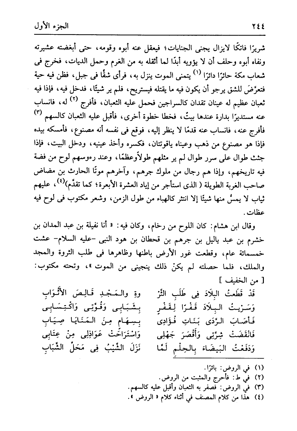 شريراً فاتكاً لَا يزَال يجني الْجِنَايَات فيعقل عَنهُ أَبوهُ وَقَومه حَتَّى ابغضته عشريته ونفاه أَبوهُ وَحلف أَن لَا يؤويه أبدا لما أثقله بِهِ من الْغرم وَحمل الدِّيات فَخرج فِي شعاب مَكَّة حائراً دائراً يتَمَنَّى الْمَوْت ينزل بِهِ فَرَأى شقاً فِي جبل فَظن فِيهِ حَيَّة فتعرض للشق يرجوا أَن يكون فِيهِ مَا يقْتله فيستريح فَلم ير شيئاَ فَدخل فِيهِ فَإِذا فِيهِ ثعبان عَظِيم لَهُ عينان تقدان كالسراجين فَحمل عَلَيْهِ الثعبان فأفرج لَهُ فانساب عَنهُ مستديراً بدارة عِنْدهَا بَيت فخطا خطْوَة أُخْرَى فَأقبل عَلَيْهِ الثعبان كالسهم فأفرج عَنهُ فانساب عَنهُ قدماً لَا ينظر إِلَيْهِ فَوَقع فِي نَفسه أَنه مَصْنُوع فأمسكه بِيَدِهِ فَإِذا هُوَ مَصْنُوع من ذهب وَعَيناهُ ياقوتتان فَكَسرهُ وَأخذ عَيْنَيْهِ وَدخل الْبَيْت فَإِذا جثث طوال على سرر طوال لم ير مثلهم طولا وعظماً وَعند رُءُوسهم لوح من فضَّة فِيهِ تاريخهم وَإِذا هم رجال من مُلُوك جرهم وَآخرهمْ موتا الْحَارِث بن مضاض صَاحب الغربة الطَّوِيلَة الَّذِي اسْتَأْجر من اياد الْعشْرَة الأبعرة كَمَا تقدم علهيم ثِيَاب لَا يمس مِنْهَا شَيْئا إِلَّا انتثر كالهباء من طول الزَّمن وَشعر مَكْتُوب فِي لوح فِيهِ عظات وَقَالَ ابْن هِشَام كَانَ اللَّوْح من رُخَام وَكَانَ فِيهِ أَنا نفيلة بن عبد المدان بن خشرم بن عبد ياليل بن جرهم بن قحطان بن هود النَّبِي عَلَيْهِ السَّلَام عِشْت خَمْسمِائَة عَام وَقطعت غور الأَرْض بَاطِنهَا وظاهرها فِي طلب الثروة وَالْمجد وَالْملك فَلَمَّا حصلته لم يكن ذَلِك ينجيني من الْمَوْت وَتَحْته مَكْتُوب // (من الْخَفِيف) //