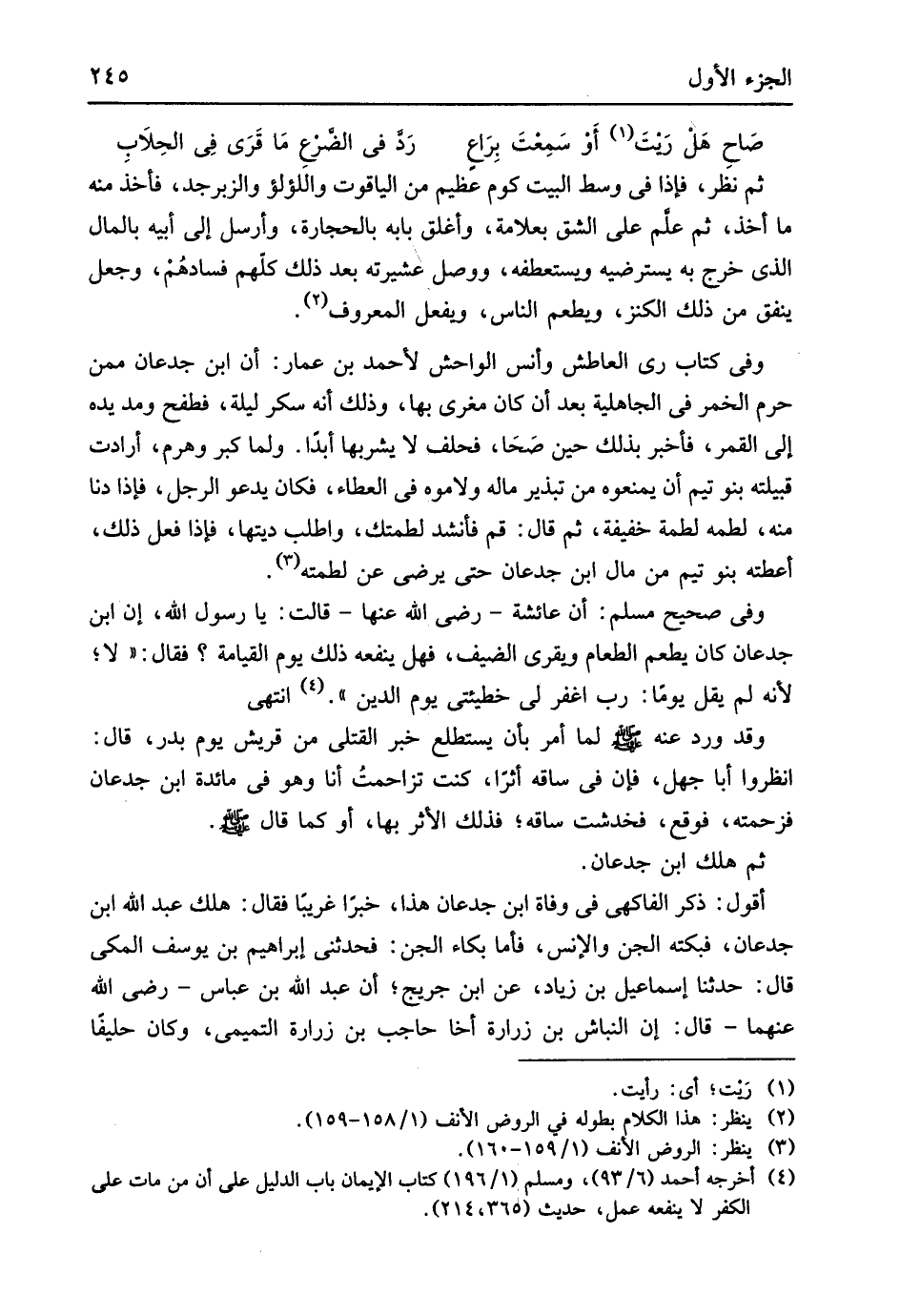 ثمَّ نظر فَإِذا فِي وسط الْبَيْت كوم عَظِيم من الْيَاقُوت واللؤلؤ والزبرجد فَأخذ مِنْهُ مَا أَخذ ثمَّ علم على الشق بعلامة وأغلق بَابه بِالْحِجَارَةِ وَأرْسل إِلَى أَبِيه بِالْمَالِ الَّذِي خرج بِهِ يسترضيه ويستعطفه وَوصل عشرته بعد ذَلِك كلهم فسادهم وَجعل ينْفق من ذَلِك الْكَنْز وَيطْعم النَّاس وَيفْعل الْمَعْرُوف وَفِي كتاب ري العاطش وَأنس الواحش لِأَحْمَد بن عمار إِن ابْن جدعَان مِمَّن حرم الْخمر فِي الْجَاهِلِيَّة بعد أَن كَانَ مغرى بهَا وَذَلِكَ أَنه سكر لَيْلَة فطفح وَمد يَده إِلَى الْقَمَر فَأخْبر بذلك حِين صَحا فَحلف لَا يشْربهَا أبدا وَلما كبر وهرم أَرَادَت قبيلته بَنو تيم أَن يمنعوه من تبذير مَاله ولاموه فِي الْعَطاء فَكَانَ يَدْعُو الرجل فَإِذا دنا مِنْهُ لطمه لطمة خَفِيفَة ثمَّ قَالَ قُم فَأَنْشد لطمتك واطلب دِيَتهَا فَإِذا فعل ذَلِك أَعطَتْهُ بَنو تيم من مَال ابْن جدعَان حَتَّى يرضى عَن لطمته وَفِي صَحِيح مُسلم أَنه عَائِشَة رَضِي الله عَنْهَا قَالَت يَا رَسُول الله إِن ابْن جدعَان كَانَ يطعم الطَّعَام ويقري الضَّيْف فَهَل يَنْفَعهُ ذَلِك يَوْم الْقِيَامَة فَقَالَ لَا لِأَنَّهُ لم يقل يَوْمًا رَبِّي اغْفِر لي خطيئتي يَوْم الدّين انْتهى وَقد ورد عَنهُ
