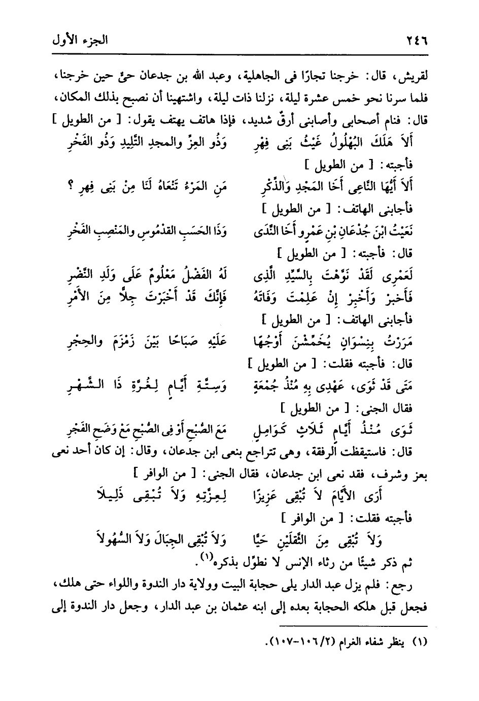 لقريش قَالَ خرجنَا تجارًا فِي الْجَاهِلِيَّة وَعبد الله بن جدعَان حَيّ حِين خرجنَا فَلَمَّا سرنا نَحْو خمس عشرَة لَيْلَة نزلنَا ذَات لَيْلَة واشتهينا أَن نصبح بذلك الْمَكَان قَالَ فَنَامَ أَصْحَابِي وأصابني أرق شَدِيد فَإِذا هَاتِف يَهْتِف يَقُول // (من الطَّوِيل) //