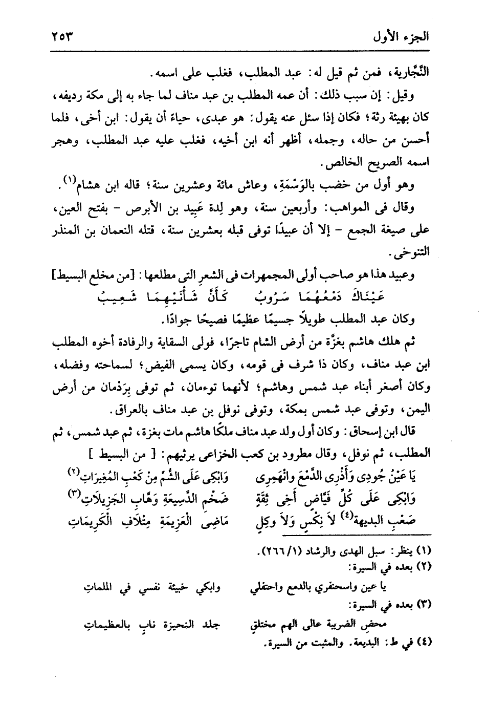 وَكَانَ عبد الْمطلب طَويلا جسيماً عَظِيما فصيحاً جواداً ثمَّ هلك هَاشم بغزة من أَرض الشَّام تَاجِرًا فولى السِّقَايَة والرفادة أَخُوهُ الْمطلب ابْن عبد منَاف وَكَانَ ذَا شرف فِي قومه وَكَانَ يُسمى الْفَيْض لسماحته وفضله وَكَانَ أَصْغَر أَبنَاء عبد شمس وهَاشِم لِأَنَّهُمَا توءمان ثمَّ توفّي بردمان من أَرض الْيمن وَتُوفِّي عبد شمس بِمَكَّة وَتُوفِّي نَوْفَل بن عبد منَاف بالعراق قَالَ ابْن إِسْحَاق وَكَانَ أول ولد عبد منَاف ملكا هَاشم مَاتَ بغزة ثمَّ عبد شمس ثمَّ الْمطلب ثمَّ نَوْفَل وَقَالَ مطرود بن كَعْب الْخُزَاعِيّ يرثيهم // (من الْبَسِيط) //