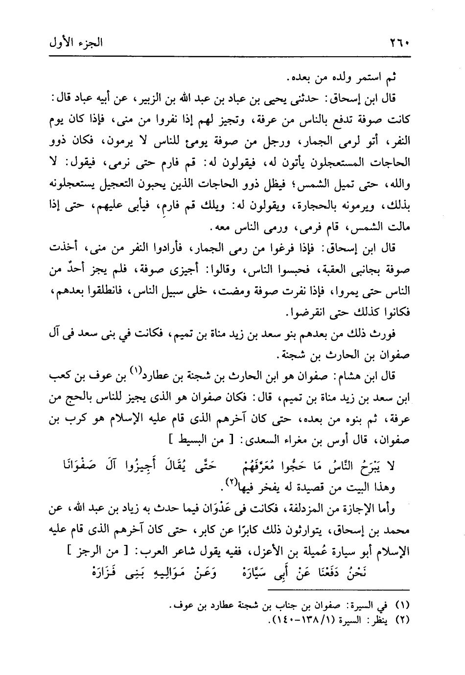 ثمَّ اسْتمرّ وَلَده من بعده قَالَ ابْن إِسْحَاق حَدثنِي يحيى بن عباد بن عبد الله بن الزبير عَن أَبِيه عباد قَالَ كَانَت صوفة تدفع بِالنَّاسِ من عَرَفَة وتجيز لَهُم إِذا نفروا من منى فَإِذا كَانَ يَوْم النَّفر أَتَوْ لرمي الْجمار وَرجل من صوفة يُومِئ للنَّاس لَا يرْمونَ فَكَانَ ذَوُو الْحَاجَات المستعجلون يأْتونَ لَهُ فَيَقُولُونَ لَهُ قُم فارم حَتَّى نرمي فَيَقُول لَا وَالله حَتَّى تميل الشَّمْس فيظل ذَوُو الْحَاجَات الَّذين يحبونَ التَّعْجِيل يستعجلونه بذلك يومونه بِالْحِجَارَةِ وَيَقُولُونَ لَهُ وَيلك قُم فارم فيأبى عَلَيْهِم حَتَّى إِذا مَالَتْ الشَّمْس قَامَ فَرمى وَرمى النَّاس مَعَه قَالَ ابْن إِسْحَاق فَإِذا فرغوا من رمي الْجمار فارادوا النَّفر من منى أخذت صوفة بجانبي الْعقبَة فحبسوا النَّاس وَقَالُوا أجيزي صوفة فَلم يجز أحد من النَّاس حَتَّى يمروا فَإِذا نفرت صوفة وَمَضَت خلى سَبِيل النَّاس فَانْطَلقُوا بعدهمْ فَكَانُوا كَذَلِك حَتَّى انقرضوا فورث ذَلِك من بعدهمْ بَنو سعيد بن زيد مَنَاة بن تَمِيم فَكَانَت فِي بني سعد فِي آل صَفْوَان بن الْحَارِث بن شجنة قَالَ ابْن هِشَام صَفْوَان هُوَ ابْن الْحَارِث بن شجنة بن عُطَارِد بن عَوْف بن كَعْب ابْن سعد بن زيد مَنَاة بن تَمِيم قَالَ فَكَانَ صَفْوَان هُوَ الَّذِي يُجِيز للنَّاس بِالْحَجِّ من عَرَفَة ثمَّ بنوه من بعده حَتَّى كَانَ آخِرهم الَّذِي قَامَ عَلَيْهِ الْإِسْلَام هُوَ كرب بن صَفْوَان قَالَ أَوْس بن مغراء السَّعْدِيّ // (من الْبَسِيط) //