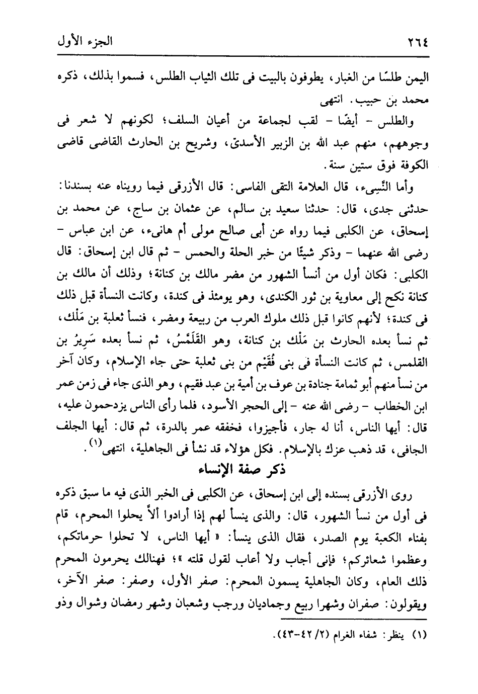 الْيمن طلساً من الْغُبَار يطوفون بِالْبَيْتِ فِي تِلْكَ الثِّيَاب الطلس فسموا بذلك ذكره مُحَمَّد بن حبيب انْتهى والطلس أَيْضا لقب لجَماعَة من أَعْيَان السّلف لكَوْنهم لَا شعر فِي وُجُوههم مِنْهُم عبد الله بن الزبير الْأَسدي وَشُرَيْح بن الْحَارِث القَاضِي قَاضِي الْكُوفَة فَوق سِتِّينَ سنة وَأما النسىء قَالَ الْعَلامَة التقي الفاسي قَالَ الْأَزْرَقِيّ فِيمَا روينَاهُ عَنهُ بسندنا حَدثنِي جدي قَالَ حَدثنَا سعيد بن سَالم عَن عُثْمَان بن سَاج عَن مُحَمَّد بن إِسْحَاق عَن الْكَلْبِيّ فِيمَا رَوَاهُ عَن أبي صَالح مولى أم هانىء عَن ابْن عَبَّاس رَضِي الله عَنْهُمَا وَذكر شَيْئا من خبر الْحلَّة والحمس ثمَّ قَالَ بن إِسْحَاق قَالَ الكبي فَكَانَ أول من أنسأ الشُّهُور من مُضر مَالك بن كنَانَة وَذَلِكَ أَن مَالك بن كنَانَة نكح إِلَى مُعَاوِيَة بن ثَوْر الْكِنْدِيّ وَهُوَ يَوْمئِذٍ فِي كِنْدَة وَكَانَت النسأة قبل ذَلِك فِي كِنْدَة لأَنهم كَانُوا قبل ذَلِك مُلُوك الْعَرَب من ربيعَة وَمُضر فنسأ ثَعْلَبَة بن ملك ثمَّ نسأ بعده الْحَارِث بن ملك بن كنَانَة وَهُوَ القلمس ثمَّ نسأ بعده سَرِير بن القلمس ثمَّ كَانَت النسأة فِي بني فقيم من بني ثَعْلَبَة حَتَّى جَاءَ الْإِسْلَام وَكَانَ آخر من نسأ مِنْهُم أَبُو ثُمَامَة جندة بن عَوْف بن أُميَّة بن عبد فقيم وَهُوَ الَّذِي جَاءَ فِي زمن عمر ابْن الْخطاب رَضِي الله عَنهُ إِلَى الْحجر الْأسود فَلَمَّا رأى النَّاس يزدحمون عَلَيْهِ قَالَ أَيهَا النَّاس أَنا لَهُ جَار فأجيزوا فخفقه عمر بِالدرةِ ثمَّ قَالَ أَيهَا الجلف الجافي قد ذهب عزك بِالْإِسْلَامِ فَكل هَؤُلَاءِ قد نَشأ فِي الْجَاهِلِيَّة انْتهى