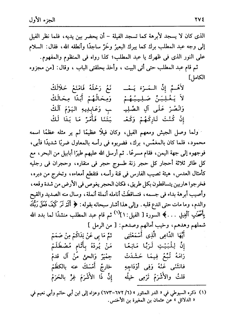 الَّذِي كَانَ لَا يسْجد لأبرهة كَمَا تسْجد الفيلة أَن يحضر بَين يَدَيْهِ فَلَمَّا نظر الْفِيل إِلَى وَجه عبد الْمطلب برك كَمَا يبرك الْبَعِير وخر سَاجِدا وأنطقه الله فَقَالَ السَّلَام على النُّور الَّذِي فِي ظهرك يَا عبد الْمطلب كَذَا رَوَاهُ فِي المنظوم وَالْمَفْهُوم ثمَّ قَامَ عبد الْمطلب حَتَّى أَتَى الْبَيْت وَأخذ بحلقتي الْبَاب وَقَالَ // (من مجزوء الْكَامِل) //