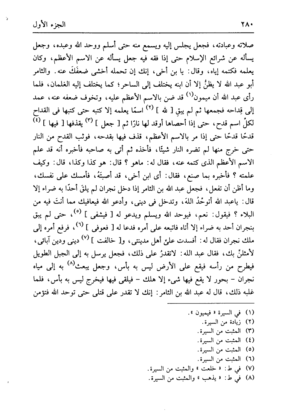 صلَاته وعبادته فَجعل يجلس إِلَيْهِ وَيسمع مِنْهُ حَتَّى أسلم ووحد الله وَعَبده وَجعل يسْأَله عَن شرائع الْإِسْلَام حَتَّى إِذا فقه فِيهِ جعل يسْأَله عَن الِاسْم الْأَعْظَم وَكَانَ يعمله فكتمه إِيَّاه وَقَالَ يَا بن أخي إِنَّك إِن تحمله أخْشَى ضعفك عَنهُ والثامر أَبُو عبد الله لَا يظنّ إِلَّا أَن ابْنه يخْتَلف إِلَى السَّاحر كَمَا يخْتَلف إِلَيْهِ الغلمان فَلَمَّا رأى عبد الله أَن مَيْمُون قد ضن بِالِاسْمِ الْأَعْظَم عَلَيْهِ وتخوف ضعفه عَنهُ عمد إِلَى قداحه فجمعها ثمَّ لم يبْق لله اسْما يُعلمهُ إِلَّا كتبه حَتَّى كتبهَا فِي القداح لكل اسْم قدح حَتَّى إِذا أحصاها أوقد لَهَا نَارا ثمَّ جعل يقذفها فِيهَا قدحاً قدحاً حَتَّى إِذا مر بِالِاسْمِ الْأَعْظَم قذف فِيهَا بقدحه فَوَثَبَ الْقدح من النَّار حَتَّى خرج مِنْهَا لم تضره النَّار شَيْئا فَأَخذه ثمَّ أَتَى بِهِ صَاحبه فَأخْبرهُ أَنه قد علم الِاسْم الْأَعْظَم الَّذِي كتمه عَنهُ فَقَالَ مَا هُوَ قَالَ لَهُ هُوَ كَذَا وَكَذَا قَالَ وَكَيف عَلمته فَأخْبرهُ بِمَا صنع فَقَالَ أَي ابْن أخي قد أصبته فَأمْسك على نَفسك وَمَا أَظن أَن تفعل فَجعل عبد الله بن الثَّامِر إِذا دخل نَجْرَان لم يلق أحدا بِهِ ضراء إِلَّا قَالَ يَا عبد الله أتوحد الله وَتدْخل فِي ديني وأدعو الله فيعافيك مِمَّا أَنْت فِيهِ من الْبلَاء فَيَقُول نعم فيوحد الله وَيسلم وَيَدْعُو لَهُ فيشفى حَتَّى لم يبْق بِنَجْرَان أحد بِهِ ضراء إِلَّا أَتَاهُ فَاتبعهُ على أمره فَدَعَا لَهُ فَعُوفِيَ فَرفع أمره إِلَى ملك نَجْرَان فَقَالَ لَهُ أفسدت عَليّ أهل مدينتي وخالفت ديني وَدين آبَائِي لَأُمَثِّلَن بك فَقَالَ عبد الله لَا تقدر على ذَلِك فَجعل يُرْسل بِهِ إِلَى الْجَبَل الطَّوِيل فيطرح من رَأسه فَيَقَع على الأَرْض لَيْسَ بِهِ بَأْس وَجعل يبْعَث بِهِ إِلَى مياه نَجْرَان بحور لَا يَقع فِيهَا شَيْء إِلَّا هلك فَيلقى فِيهَا فَيخرج لَيْسَ بِهِ بَأْس فَلَمَّا غَلبه ذَلِك قَالَ لَهُ عبد الله بن الثَّامِر إِنَّك لَا تقدر على قَتْلِي حَتَّى توَحد الله فتؤمن