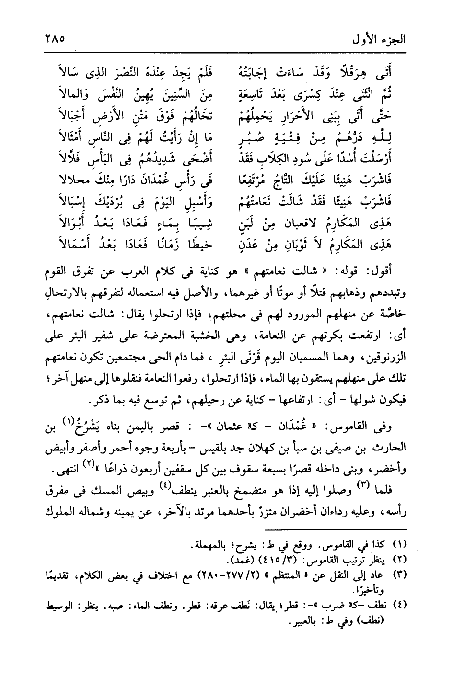 أَقُول قَوْله شالت نعامتهم هُوَ كِنَايَة فِي كَلَام الْعَرَب عَن تفرق الْقَوْم وتبددهم وذهابهم قتلا أَو موتا أَو غَيرهمَا وَالْأَصْل فِيهِ اسْتِعْمَاله لتفرقتهم بالارتحال خَاصَّة عَن منهلهم المورود لَهُم فِي محلتهم فَإِذا ارتحلوا يُقَال شالت نعامتهم أَي ارْتَفَعت بكرتهم عَن النعامة وَهِي الْخَشَبَة المعترضة على شَفير الْبِئْر على الزرنوقين وهما المسميان الْيَوْم قَرْني الْبِئْر فَمَا دَامَ الْحَيّ مُجْتَمعين تكون نعامتهم تِلْكَ على منهلهم يستقون بهَا المَاء فَإِذا ارتحلوا رفعوا النعامة فنقلوها إِلَى منهل آخر فَيكون شولها أَي ارتفاعها كِنَايَة عَن رحيلهم ثمَّ توسع فِيهِ بِمَا ذكر وَفِي الْقَامُوس غمدان كعثمان قصر بِالْيمن بِنَاء يشرخ بن الْحَارِث بن صَيْفِي بن سبأ بن كهلان جد بلقيس بأَرْبعَة وُجُوه أَحْمَر وأصفر وأبيض وأخضر وَبنى دَاخله قصراً بسبعة سقوف بَين كل سقفين أَرْبَعُونَ ذِرَاعا انْتهى فَلَمَّا وصلوا إِلَيْهِ إِذا هُوَ متضمخ بالعنبر ينطف وبيص الْمسك فِي مفرق رَأسه وَعَلِيهِ رداءان أخضران متزر بِأَحَدِهِمَا مُرْتَد بِالْآخرِ عَن يَمِينه وشماله الْمُلُوك