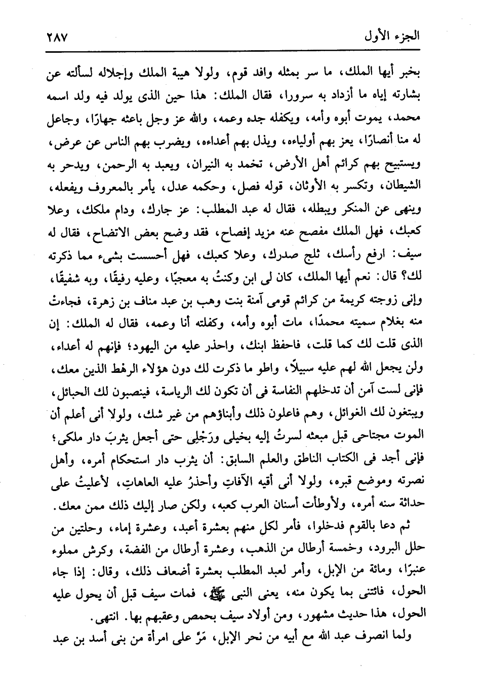 بِخَبَر أَيهَا الْملك مَا سر بِمثلِهِ وَافد قوم وَلَوْلَا هَيْبَة الْملك وإجلاله لسألته عَن بشارته إِيَّاه مَا أزداد بِهِ سُرُورًا فَقَالَ الْملك هَذَا حِين الَّذِي يُولد فِيهِ ولد اسْمه مُحَمَّد يَمُوت أَبوهُ وَأمه ويكفله جده وَعَمه وَالله عز وَجل باعثه جهاراً وجاعل لَهُ منا أنصاراً يعز بهم أولياءه ويذل بهم اعداءه وَيضْرب بهم النَّاس عَن عرض ويستبيح بهم كرائم أهل الأَرْض تخمد بِهِ النيرَان ويعبد بِهِ الرَّحْمَن ويدحر بِهِ الشَّيْطَان وتكسر بِهِ الْأَوْثَان قَوْله فصل وَحكمه عدل يَأْمر بِالْمَعْرُوفِ ويفعله وَيُنْهِي عَن الْمُنكر ويبطله فَقَالَ لَهُ عبد الْمطلب عز جَارك ودام ملكك وَعلا كعبك فَهَل الْملك مفصح عَنهُ مزِيد إفصاح فقد وضح بعض الاتضاح فَقَالَ لَهُ سيف ارْفَعْ رَأسك ثلج صدرك وَعلا كعبك فَهَل أحسست بِشَيْء مِمَّا ذكرته لَك قَالَ نعم أَيهَا الْملك كَانَ لي ابْن وَكنت بِهِ معجباً وَعَلِيهِ رَفِيقًا وَبِه شفيقاً وَإِنِّي زَوجته كَرِيمَة من كرائم قومِي آمِنَة بنت وهب بن عبد منَاف بن زهرَة فَجَاءَت مِنْهُ بِغُلَام سميته مُحَمَّدًا مَاتَ أَبوهُ وَأمه وكفلته أَنا وَعَمه فَقَالَ لَهُ الْملك إِن الَّذِي قلت لَك كَمَا قلت فاحفظ ابْنك وَاحْذَرْ عَلَيْهِ من الْيَهُود فَإِنَّهُم لَهُ أَعدَاء وَلنْ يَجْعَل الله لَهُم عَلَيْهِ سَبِيلا واطو مَا ذكرت لَك دون هَؤُلَاءِ الرَّهْط الَّذين مَعَك فَإِنِّي لست آمن أَن تدخلهم النفاسة فِي أَن تكون لَك الرياسة فَيَنْصبُونَ لَك الحبائل ويبتغون لَك الغوائل وهم فاعلون ذَلِك وابناؤهم من غير شكّ وَلَوْلَا اني أعلم أَن الْمَوْت مجتاحي قبل مبعثه لسرت إِلَيْهِ بخيلي ورجلي حَتَّى أجعَل يثرب دَار ملكي فَإِنِّي أجد فِي الْكتاب النَّاطِق وَالْعلم السَّابِق أَن يثرب دَار استحكام أمره وَأهل نصرته وَمَوْضِع قَبره وَلَوْلَا أَنِّي أقيه الْآفَات وَأحذر عَلَيْهِ العاهات لأعليت على حَدَاثَة سنه أمره ولأوطأت أَسْنَان الْعَرَب كَعبه وَلَكِن صَار إِلَيْك ذَلِك مِمَّن مَعَك ثمَّ دَعَا بالقوم فَدَخَلُوا فَأمر لكل مِنْهُم بِعشْرَة أعبد وَعشرَة إِمَاء وحلتين من حلل البرود وَخَمْسَة أَرْطَال من الذَّهَب وَعشرَة أَرْطَال من الْفضة وكرش مَمْلُوء عنبراً وَمِائَة من الْإِبِل وَأمر لعبد الْمطلب بِعشْرَة أَضْعَاف ذَلِك وَقَالَ إِذا جَاءَ الْحول فائتني بِمَا يكون مِنْهُ يَعْنِي النَّبِي