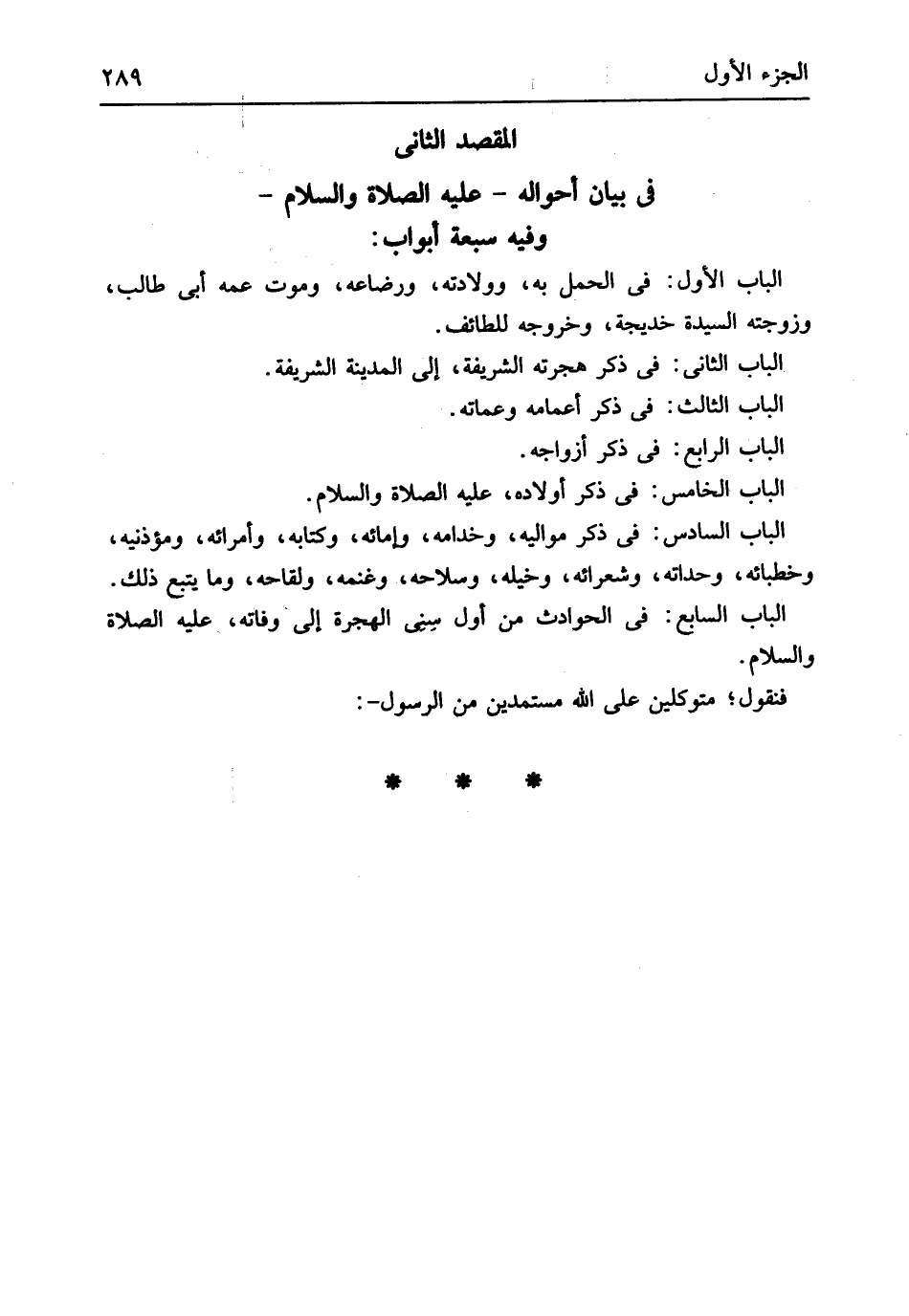 الْبَاب الأول فِي الْحمل بِهِ وولادته ورضاعته وَمَوْت عَمه أبي طَالب وَزَوجته السيدة خَدِيجَة وَخُرُوجه للطائف الْبَاب الثَّانِي فِي ذكر هجرته الشَّرِيفَة إِلَى الْمَدِينَة الشَّرِيفَة الْبَاب الثَّالِث فِي ذكر أَعْمَامه وعماته الْبَاب الرَّابِع فِي ذكر أَزوَاجه الْبَاب الْخَامِس فِي ذكر أَوْلَاده عَلَيْهِ الصَّلَاة وَالسَّلَام الْبَاب السَّادِس فِي ذكر موَالِيه وخدامه وإمائه وَكتابه وأمرائه ومؤذنيه وخطبائه وحداته وشعرائه وخيله وسلاحه وغنمه ولقاحه وَمَا يتبع ذَلِك الْبَاب السَّابِع فِي الْحَوَادِث من أول سني الْهِجْرَة إِلَى وَفَاته عَلَيْهِ الصَّلَاة وَالسَّلَام فَنَقُول متوكلين على الله مستمدين من الرَّسُول