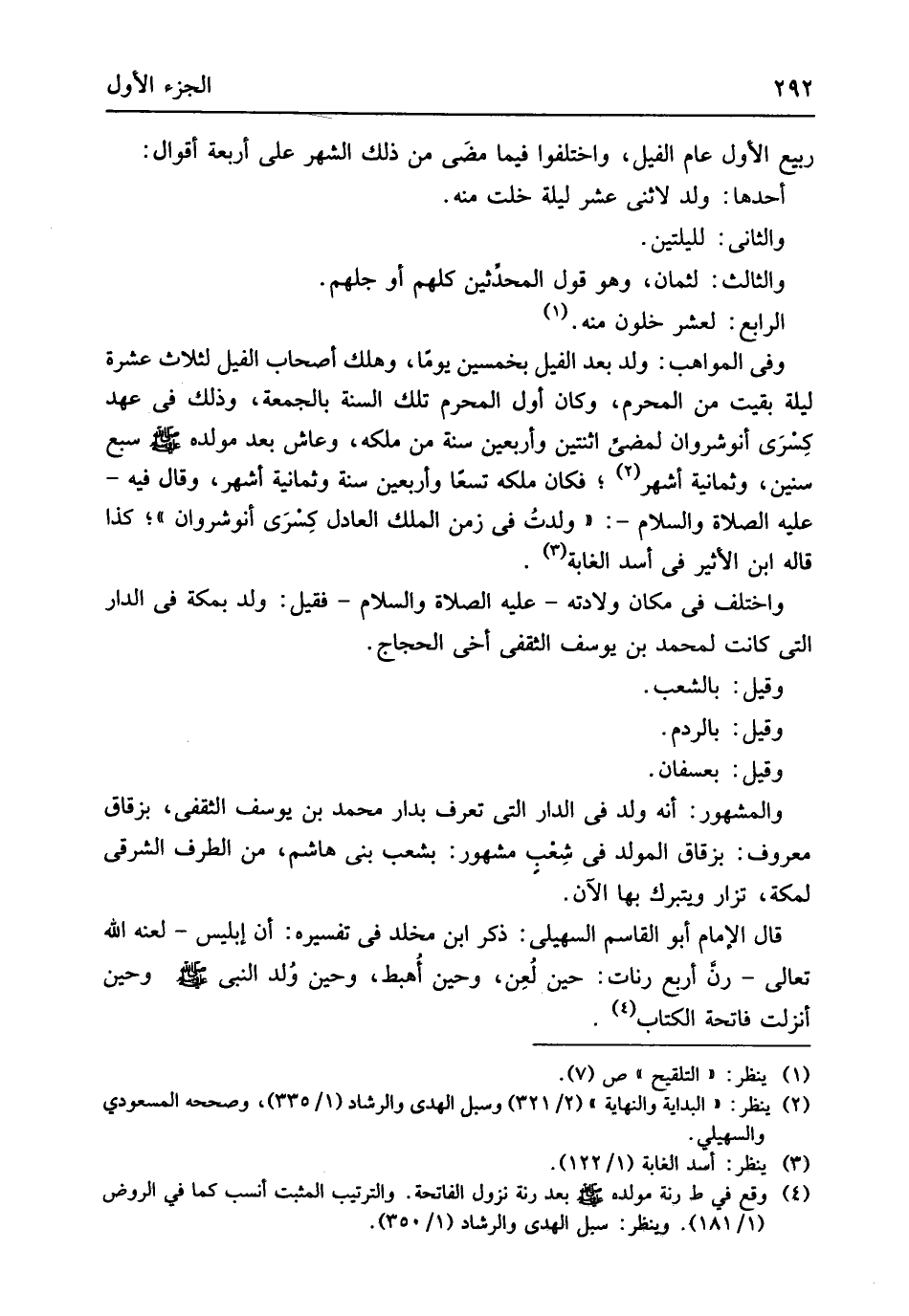 ربيع الأول عَام الْفِيل وَاخْتلفُوا فِيمَا مضى من ذَلِك الشَّهْر على أَرْبَعَة أَقْوَال أَحدهَا ولد لاثني عشر لَيْلَة خلت مِنْهُ وَالثَّانِي لليلتين وَالثَّالِث لثمان وَهُوَ قَول الْمُحدثين كلهم أَو جلهم الرَّابِع لعشر خلون مِنْهُ وَفِي الْمَوَاهِب ولد بعد الْفِيل بِخَمْسِينَ يَوْمًا وَهلك أَصْحَاب الْفِيل لثلاث عشرَة لَيْلَة بقيت من الْمحرم وَكَانَ أول الْمحرم تِلْكَ السّنة بِالْجمعَةِ وَذَلِكَ فِي عهد كسْرَى أنوشروان لمضي اثْنَتَيْنِ وَأَرْبَعين سنة من ملكه وعاش بعد مولده
