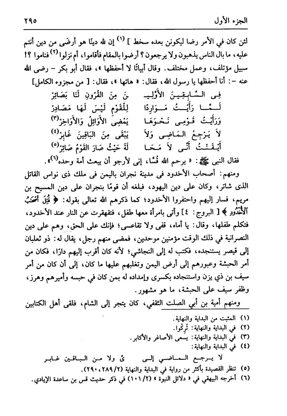 يرحم الله قسا اني لأرجو إِن يبْعَث أمة وَاحِدَة وَمِنْهُم أَصْحَاب الْأُخْدُود فِي مَدِينَة نَجْرَان بِالْيمن فِي ملك ذِي نواس الْقَاتِل الَّذِي شاتر وَكَانَ على دين الْيَهُود فَبَلغهُ أَنه قوما بِنَجْرَان على دين الْمَسِيح بن مَرْيَم فَسَار إِلَيْهِم واحتفروا الْأُخْدُود كَمَا ذكرهم الله تَعَالَى بقوله {قتل أَصْحَاب الأُخْدُودِ} البروج 4 وأتى بِامْرَأَة مَعهَا طِفْل فتقهقرت عَن النَّار عِنْد الْأُخْدُود فَتكلم طلفها وَقَالَ يَا أُمَّاهُ قفي وَلَا تقاعسي فَإنَّك على الْحق وهم على دين النَّصْرَانِيَّة فِي ذَلِك الْوَقْت مُؤمنين مُوَحِّدين فَمضى مِنْهُم رجل يُقَال لَهُ ذُو ثعلبان إِلَى قَيْصر يستنجده فَكتب لَهُ إِلَى النَّجَاشِيّ لِأَنَّهُ كَانَ أقرب إِلَيْهِم دَارا فَكَانَ من أَمر الْحَبَشَة وعبورهم إِلَى أَرض الْيمن وتغلبهم عَلَيْهَا مَا كَانَ إِلَى أَن كَانَ من أَمر سيف بن ذِي يزن واستنجاده بكسرى وإمداده لَهُ بِمن كَانَ فِي حَبسه وأميرهم وهرز وظفر سيف على الْحَبَشَة مَا هُوَ مَشْهُور وَمِنْهُم أُميَّة بن أبي الصَّلْت الثَّقَفِيّ كَانَ يتجر إِلَى الشَّام فلقي أهل الْكِتَابَيْنِ