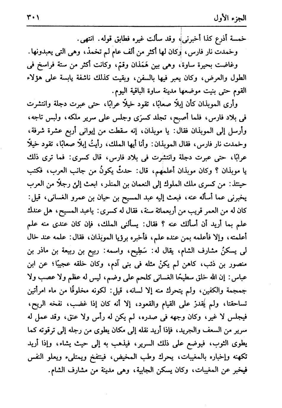 خَمْسَة أَذْرع كَذَا أَخْبرنِي وَقد سَأَلت غَيره فطابق قَوْله انْتهى وخمدت نَار فَارس وَكَانَ لَهَا أَكثر من ألف عَام لم تخمد وَهِي الَّتِي يعبدونها وغاصت بحيرة ساوة وَهِي بَين همذان وقم وَكَانَت أَكثر من سِتَّة فراسخ فِي الطول وَالْعرض وَكَانَ يعبر فِيهَا بالسفن وَبقيت كَذَلِك ناشفة يابسة على هَؤُلَاءِ الْقَوْم حَتَّى بنيت موضعهَا مَدِينَة ساوة الْبَاقِيَة الْيَوْم وَأرى الموبذان كَأَن إبِلا صعاباً تقود خيلاً عراباً حَتَّى عبرت دجلة وانتشرت فِي بِلَاد فَارس فَلَمَّا أصبح تجلد كسْرَى وَجلسَ على سَرِير ملكه وَلبس تاجه وَأرْسل إِلَى الموبذان فَقَالَ يَا موبذان أَنه سَقَطت من ايواني أَربع عشة شرفة وخمدت نَار فَارس فَقَالَ الموبذان وَأَنا أَيهَا الْملك رَأَيْت إبِلا صعاباً تقود خيلاً حَتَّى عبرت دجلة وانتشرت فِي بِلَاد فَارس قَالَ كسْرَى فَمَا ترى ذَلِك يَا موبذان وَكَانَ موبذان أعلمهم قَالَ حدث يكون من جَانب الْعَرَب فَكتب حِينَئِذٍ من كسْرَى ملك الْمُلُوك إِلَى النُّعْمَان بن الْمُنْذر ابْعَثْ إِلَيّ رجلا من الْعَرَب يُخْبِرنِي عَمَّا أسأله عَنهُ فَبعث إِلَيْهِ عبد الْمَسِيح بن حَيَّان بن عَمْرو الغساني قيل كَانَ لَهُ من الْعُمر قريب من أَرْبَعمِائَة سنة فَقَالَ لَهُ كسْرَى يَا عبد الْمَسِيح هَل عنْدك علم بِمَا أُرِيد أَن أَسأَلك عَنهُ فَقَالَ يسألني الْملك فَإِن كَانَ عِنْدِي مِنْهُ علم أعلمته وَإِلَّا فَأعلمهُ بِمن عِنْده علم فَأخْبرهُ برؤيا الموبذان فَقَالَ علمه عِنْد خَال لي يسكن مشارف الشَّام يُقَال لَهُ سطيح واسْمه ربيع بن ربيعَة بن ماذر بن مَنْصُور بن ذِئْب كَاهِن لم يكن مثله فِي بني آدم وَكَانَ خلقه عجيباً عَن ابْن عَبَّاس إِن الله خلق سطيحاً الغساني كلحم على وَضم لَيْسَ لَهُ عظم وَلَا عصب وَلَا جمجمة وَالْكَفَّيْنِ وَلم يَتَحَرَّك مِنْهُ إِلَّا لِسَانه قيل لكَونه مخلوقاً من مَاء امْرَأتَيْنِ تساحقتا وَلم يقدر على الْقيام وَالْقعُود إِلَّا أَنه كَانَ إِذا غضب نفخه الرّيح فيجلس لَا غير وَكَانَ وَجهه فِي صَدره لم يكن لَهُ رَأس وَلَا عنق وَقد عمل لَهُ سَرِير من السعف والجريد فَإِذا أُرِيد نَقله إِلَى مَكَان يطوى من رجله إِلَى ترقة ته كَمَا يطوى الثَّوْب فَيُوضَع على ذَلِك السرير فَيذْهب بِهِ إِلَى حَيْثُ يَشَاء وَإِذا أُرِيد تكهنه وإخباره بالمغيبات يُحَرك وطب المخيض فينتفخ ويمتلىء ويعلو النَّفس فيخبر عَن المغيبات وَكَانَ يسكن الْجَابِيَة وَهِي مَدِينَة من مشارف الشَّام