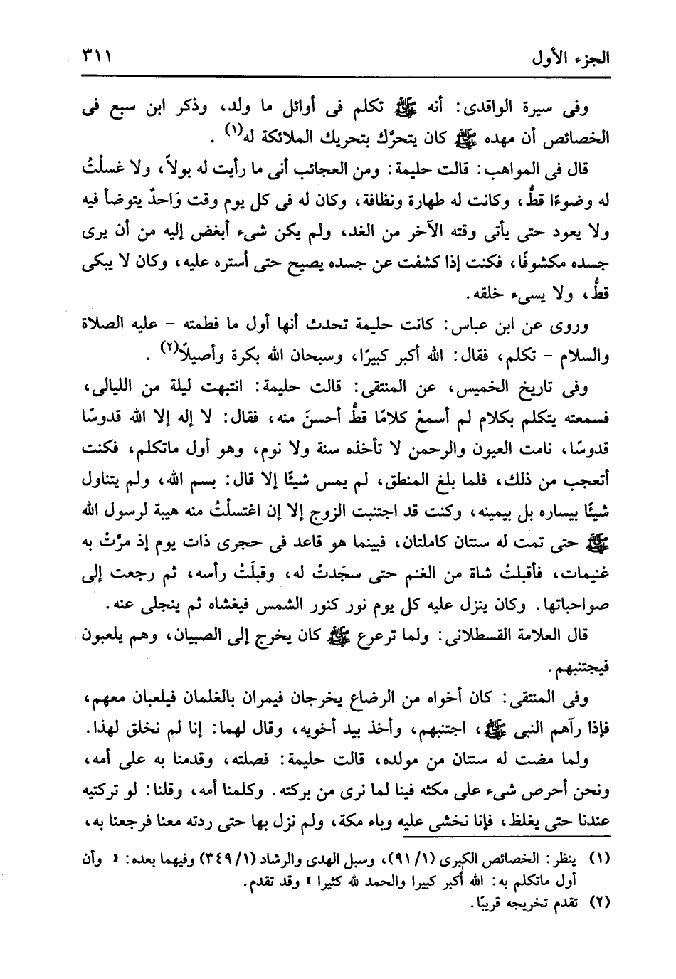 كَانَ يَتَحَرَّك بتحريك الْمَلَائِكَة لَهُ قَالَ فِي الْمَوَاهِب قَالَت حليمة وَمن الْعَجَائِب أَنِّي مَا رَأَيْت لَهُ بولاً وَلَا غسلت لَهُ وضُوءًا قطّ وَكَانَت لَهُ طَهَارَة ونظافة وَكَانَ لَهُ فِي كل يَوْم وَقت وَاحِد يتَوَضَّأ فِيهِ وَلَا يعود حَتَّى يَأْتِي وقته الآخر من الْغَد وَلم يكن شَيْء أبْغض إِلَيْهِ من أَن يرى جسده مكشوفاً فَكنت إِذا كشفت عَن جسده يَصِيح حَتَّى أستره عَلَيْهِ وَكَانَ لَا يبكي قطّ وَلَا يسيء خلقه وروى عَن ابْن عَبَّاس كَانَت حليمة تحدث أَنَّهَا أول مَا فَطَمته عَلَيْهِ الصَّلَاة وَالسَّلَام تكلم فَقَالَ الله اكبر كَبِير وَسُبْحَان الله بكرَة وَأَصِيلا وَفِي تَارِيخ الْخَمِيس عَن المنتقي قَالَت حليمة انْتَبَهت لَيْلَة من اللَّيَالِي فَسَمعته يتَكَلَّم بِكَلَام لم أسمع كلَاما قطّ أحسن مِنْهُ فَقَالَ لَا إِلَه إِلَّا الله قدوساً قدوساً نَامَتْ الْعُيُون والرحمن لَا تَأْخُذهُ سنة وَلَا نوم وَهُوَ أول مَا تكلم فَكنت أتعجب من ذَلِك فَلَمَّا بلغ الْمنطق لم يمس شَيْئا إِلَّا قَالَ بِسم الله وَلم يتَنَاوَل شَيْئا بيساره بل بِيَمِينِهِ وَكنت قد اجْتنبت الزَّوْج إِلَّا إِن اغْتَسَلت مِنْهُ هَيْبَة لرَسُول الله