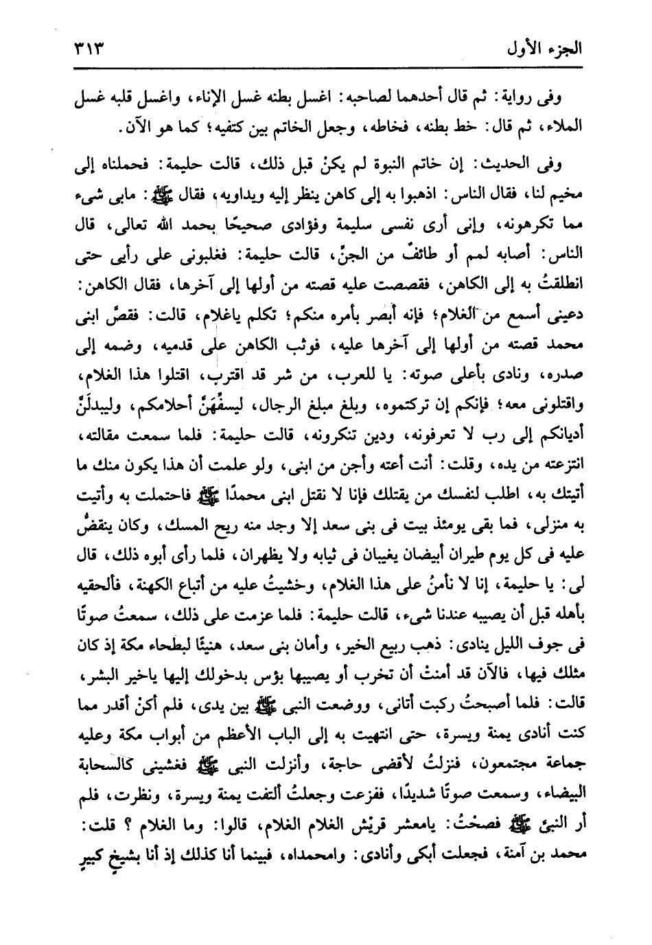 مَا بِي شَيْء مِمَّا تكرهونه وَإِنِّي أرى نَفسِي سليمَة وفؤادي صَحِيحا بِحَمْد الله تَعَالَى قَالَ النَّاس أَصَابَهُ لمَم أَو طائف من الْجِنّ قَالَت حليمة فغلبوني على رَأْيِي حَتَّى انْطَلَقت بِهِ إِلَى الكاهن فقصصت عَلَيْهِ قصَّته من أَولهَا إِلَى آخرهَا فَقَالَ الكاهن دعيني أسمع من الْغُلَام فَإِنَّهُ أبْصر بأَمْره مِنْكُم تكلم يَا غُلَام قَالَت فَقص ابْني مُحَمَّد قصَّته من أَولهَا إِلَى آخرهَا عَلَيْهِ فَوَثَبَ الكاهن على قَدَمَيْهِ وضمه إِلَى صَدره ونادى بِأَعْلَى صَوته يَا للْعَرَب من شَرّ قد اقْترب اقْتُلُوا هَذَا الْغُلَام واقتلوني مَعَه فَإِنَّكُم إِن تَرَكْتُمُوهُ وَبلغ مبلغ الرِّجَال ليسفهن أحلامكم وليبدلن أديانكم إِلَى رب لَا تعرفونه وَدين تُنْكِرُونَهُ قَالَت حليمة فَلَمَّا سَمِعت مقَالَته انتزعته من يَده وَقلت أَنْت أعته وأجن من ابْني وَلَو علمت أَن هَذَا يكون مِنْك مَا أَتَيْتُك بِهِ اطلب لنَفسك من يقتلك فانا لَا نقْتل ابْني مُحَمَّدًا