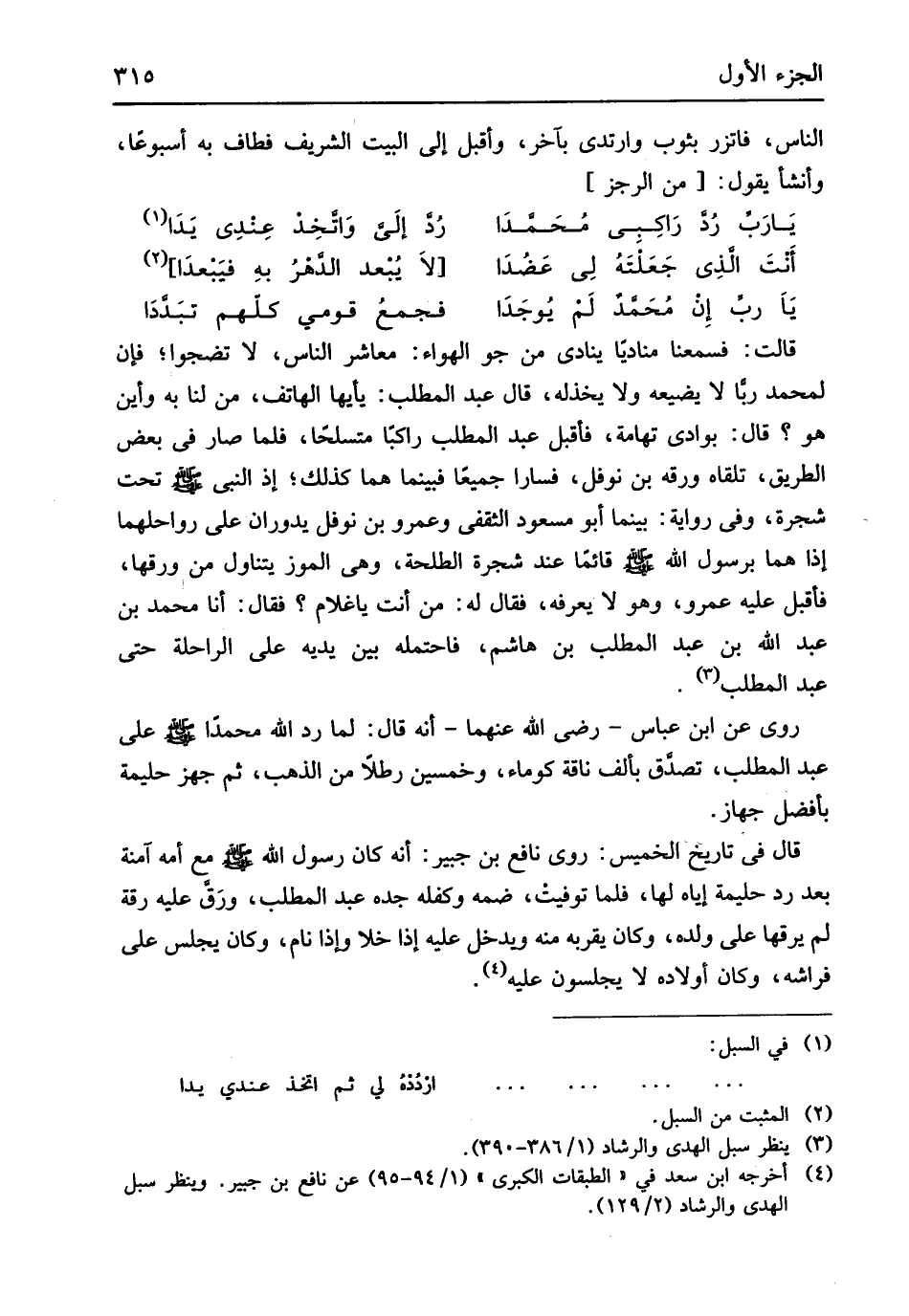 قَائِما عِنْد شَجَرَة الطلحة هِيَ الموز يتَنَاوَل من وَرقهَا فَأقبل عَلَيْهِ عَمْرو وَهُوَ لَا يعرفهُ فَقَالَ لَهُ من أَنْت يَا غُلَام فَقَالَ أَنا مُحَمَّد بن عبد الله بن عبد الْمطلب بن هَاشم فاحتمله بَين يَدَيْهِ على الرَّاحِلَة حَتَّى عبد الْمطلب روى عَن ابْن عَبَّاس رَضِي الله عَنْهُمَا أَنه قَالَ لما رد الله مُحَمَّدًا