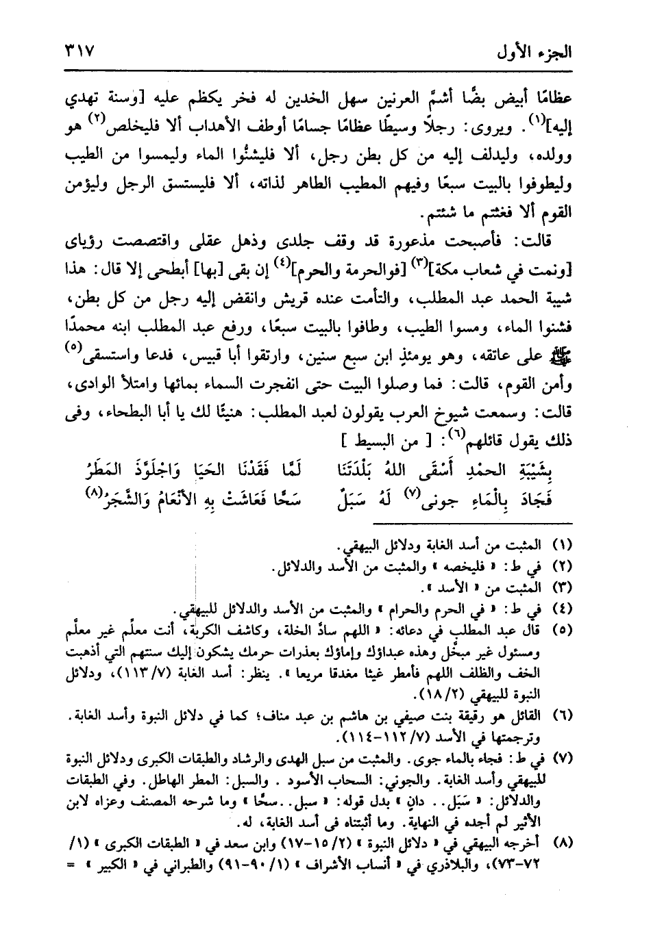 على عَاتِقه وَهُوَ يَوْمئِذٍ ابْن سبع سِنِين وارتقوا أَبَا قبيس فَدَعَا واستسقى وَأمن الْقَوْم قَالَت فَمَا وصلوا الْبَيْت حَتَّى انفجرت السَّمَاء بِمَائِهَا وامتلأ الْوَادي قَالَت وَسمعت شُيُوخ الْعَرَب يَقُولُونَ لعبد الْمطلب هَنِيئًا لَك يَا أَبَا الْبَطْحَاء وَفِي ذَلِك يَقُول قَائِلهمْ // (من الْبَسِيط) //