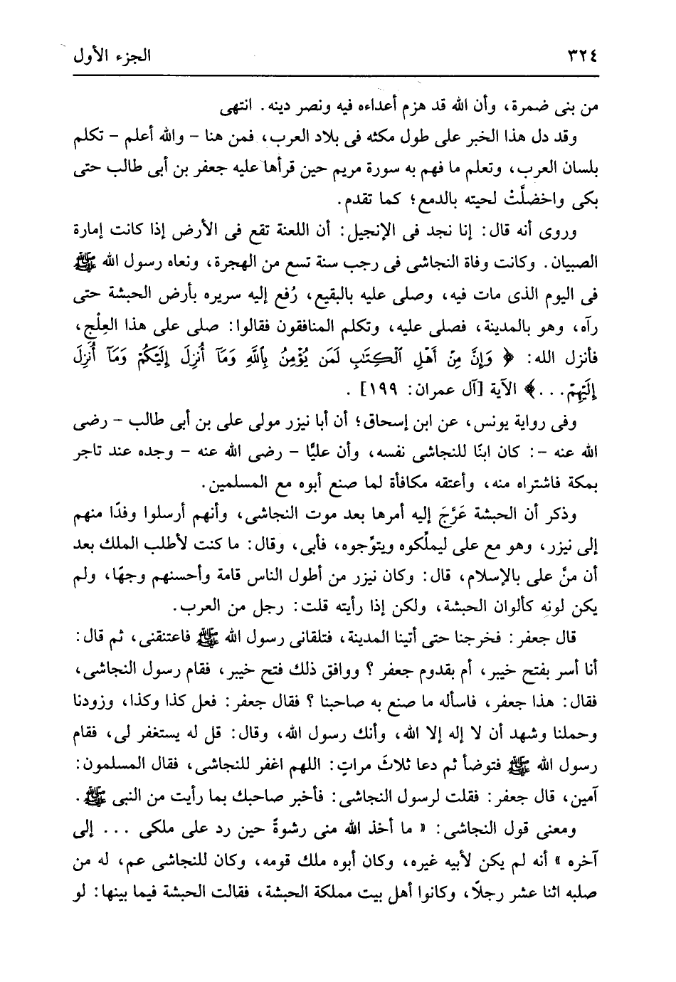 فِي الْيَوْم الَّذِي مَاتَ فِيهِ وَصلى عَلَيْهِ بِالبَقِيعِ رفع إِلَيْهِ سَرِيره بِأَرْض الْحَبَشَة حَتَّى رَآهُ وَهُوَ بِالْمَدِينَةِ فصلى عَلَيْهِ وَتكلم المُنَافِقُونَ فَقَالُوا صلى على هَذَا العلج فَأنْزل الله {وَإِن من أهل الْكتاب لَمَن يُؤْمِنُ بِاللَّهِ وَمَا أُنزِلَ إِلَيْكُمْ وَمَا أُنزِلَ إِلَيْهِمْ} الْآيَة آل عمرَان 199 وَفِي رِوَايَة يُونُس عَن ابْن إِسْحَاق أَن أَبَا نيزر مولى عَليّ بن أبي طَالب رَضِي الله عَنهُ كَانَ ابْنا للنجاشي نَفسه وَأَن عليا رَضِي الله عَنهُ وجده عِنْد تَاجر بِمَكَّة فَاشْتَرَاهُ مِنْهُ وَأعْتقهُ مُكَافَأَة لما صنع أَبوهُ مَعَ الْمُسلمين وَذكر أَن الْحَبَشَة عرج إِلَيْهِ أمرهَا بعد موت النَّجَاشِيّ وَأَنَّهُمْ أرْسلُوا وَفْدًا مِنْهُم إِلَى نيزر وَهُوَ مَعَ عَليّ ليملكوه ويتوجوه فَأبى وَقَالَ مَا كنت لأطلب الْملك بعد أَن منّ عَليّ بِالْإِسْلَامِ قَالَ وَكَانَ نيزر من أطول النَّاس قامة وَأَحْسَنهمْ وَجها وَلم يكن لَونه كألوان الْحَبَشَة وَلَكِن إِذا رَأَيْته قلت رجل من الْعَرَب قَالَ جَعْفَر فخرجنا حَتَّى أَتَيْنَا الْمَدِينَة فتلقاني رَسُول الله