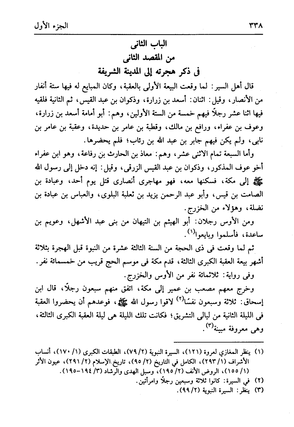 إِلَى مَكَّة فسكنها مَعَه فَهُوَ مُهَاجِرِي أَنْصَارِي قتل يَوْم أحد وَعبادَة بن الصَّامِت بن قيس وابو عبد الرَّحْمَن بن ثَعْلَبَة البلوي وَالْعَبَّاس بن عبَادَة بن نَضْلَة وَهَؤُلَاء من الْخَزْرَج وَمن الْأَوْس رجلَانِ أَبُو الْهَيْثَم بن التيهَان من بني عبد الْأَشْهَل وعويم بن سَاعِدَة فأسلموا وَبَايَعُوا ثمَّ لما وَقعت فِي ذِي الْحجَّة من السّنة الثَّالِثَة عشرَة من النُّبُوَّة قبل الْهِجْرَة بِثَلَاثَة أشهر بيعَة الْعقبَة الْكُبْرَى الثَّالِثَة قدم مَكَّة فِي موسم الْحَج قريب من خَمْسمِائَة نفر وَفِي رِوَايَة ثَلَاثمِائَة نفر من الْأَوْس والخزرج وَخرج مَعَهم مُصعب بن عُمَيْر إِلَى مَكَّة اتّفق مِنْهُم سَبْعُونَ رجلا قَالَ ابْن إِسْحَاق ثَلَاثَة وَسَبْعُونَ نفسا لاقوا رَسُول الله