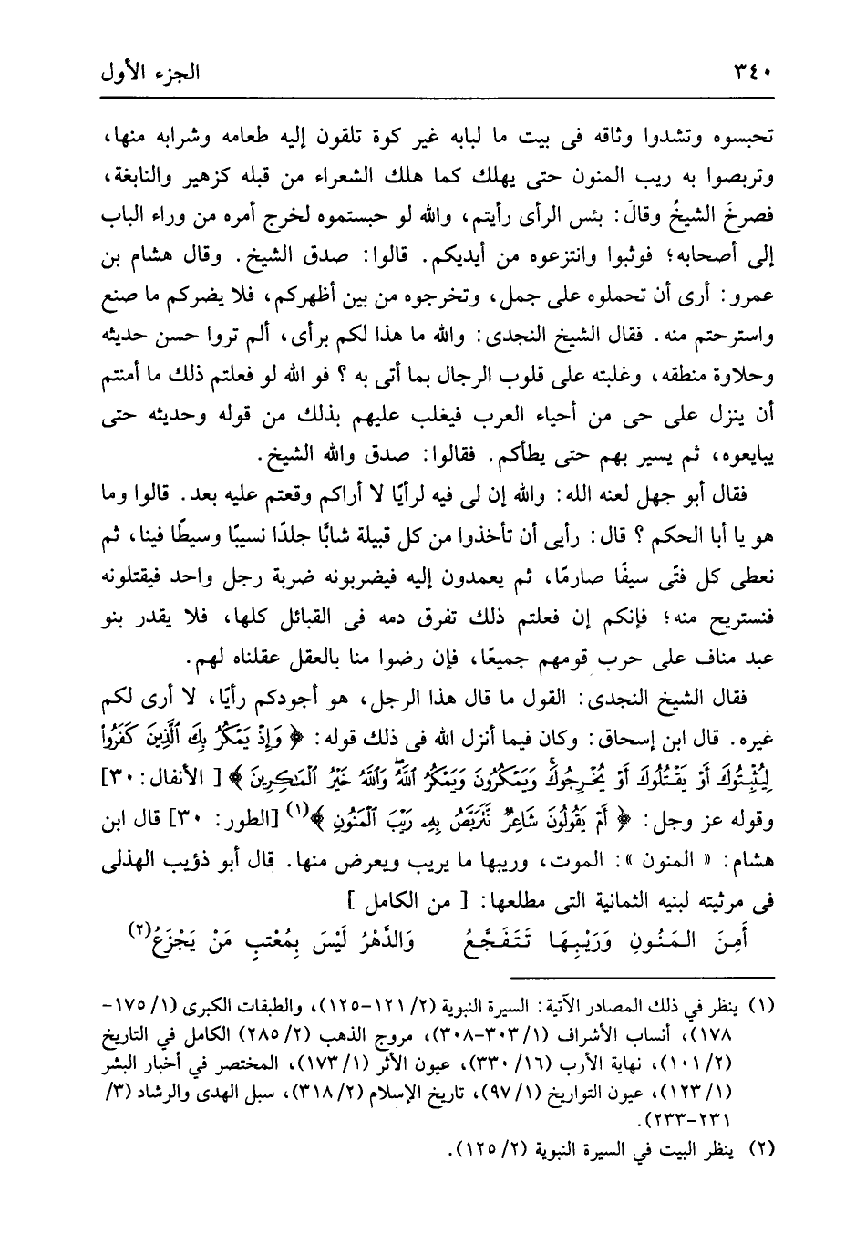 تَحْبِسُوهُ وتشدوا وثَاقه فِي بَيت مَا لبابه غير كوَّة تلقونَ إِلَيْهِ طَعَامه وَشَرَابه مِنْهَا وتربصوا بِهِ ريب الْمنون حَتَّى يهْلك كَمَا هلك الشُّعَرَاء من قبله كزهير والنابغة فَصَرَخَ الشَّيْخ وَقَالَ بئس الرَّأْي رَأَيْتُمْ وَالله لَو حبستموه لخرج أمه من وَرَاء الْبَاب إِلَى أَصْحَابه فَوَثَبُوا وانتزعوه من أَيْدِيكُم قَالُوا صدق الشَّيْخ وَقَالَ هِشَام بن عَمْرو أرى أَن تَحملُوهُ على جمل وتخرجوه من بَين أظْهركُم فَلَا يضركم مَا صنع وَاسْتَرَحْتُمْ مِنْهُ فَقَالَ الشَّيْخ النجدي وَالله مَا هَذَا لكم بِرَأْي ألم تروا حسن حيدثه وحلاوة مَنْطِقه وغلبته على قُلُوب الرِّجَال بِمَا أَتَى بِهِ فوَاللَّه لَو فَعلْتُمْ ذَلِك مَا أمنتم أَن ينزل على حَيّ من أَحيَاء الْعَرَب فيغلب عَلَيْهِم بذلك من قَوْله وَحَدِيثه حَتَّى يبايعوه ثمَّ يسير بهم حَتَّى يطأكم فَقَالُوا صدق وَالله الشَّيْخ فَقَالَ أَبُو جهل لَعنه الله وَالله إِن لي فِيهِ لرأياً لَا أَرَاكُم وَقَعْتُمْ عَلَيْهِ بعد قَالُوا وَمَا هُوَ يَا أَبَا الحكم قَالَ رَأْي أَن تَأْخُذُوا من كل قَبيلَة شَابًّا جلدا نسيما وَسِيطًا فِينَا ثمَّ نعطي كل فَتى سَيْفا صَارِمًا ثمَّ يَعْمِدُونَ إِلَيْهِ فَيَضْرِبُونَهُ ضَرْبَة رجل وَاحِد فيقتلونه فنستريح مِنْهُ فَإِنَّكُم إِن فَعلْتُمْ ذَلِك تفرق دَمه فِي الْقَبَائِل كلهَا فَلَا يقدر بَنو عبد منَاف على حَرْب قَومهمْ جَمِيعًا فَإِن رَضوا منا بِالْعقلِ عَقَلْنَاهُ لَهُم فَقَالَ الشَّيْخ النجدي القَوْل مَا قَالَ هَذَا الرجل هُوَ أَجودكُم رَأيا لَا أرى لكم غَيره قَالَ ابْن إِسْحَاق وَكَانَ فِيمَا أنزل الله فِي ذَلِك قَوْله {وَإِذْ يَمْكُرُ بِكَ الَّذِينَ كَفَرُواْ لِيُثْبِتُوكَ أَوْ يَقْتُلُوكَ أَوْ يُخْرِجُوكَ ويمكرون ويمكر الله وَالله خير الماكرين} الْأَنْفَال 30 وَقَوله عز وَجل {أًمْ يَقُولُونَ شَاعِرٌ نتربص بِهِ رَيْبَ الْمَنُونِ} الطّور 30 قَالَ ابْن هِشَام الْمنون الْمَوْت وريبها مَا يريب ويعرض مِنْهَا قَالَ أَبُو ذُؤَيْب الْهُذلِيّ فِي مرثيته لِبَنِيهِ الثَّمَانِية الَّتِي مطْلعهَا // (من الْكَامِل) //