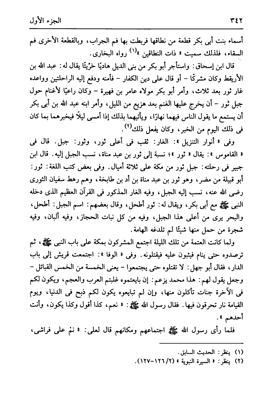 أَسمَاء بنت أبي بكر قِطْعَة من نطاقها فَربطت بهَا فَم الجراب وبالقطعة الْأُخْرَى فَم السقاء فَلذَلِك سميت ذَات النطاقين رَوَاهُ البُخَارِيّ قَالَ ابْن إِسْحَاق واستأجر أَبُو بكر من بني الديل هادياً خريتاً يُقَال لَهُ عبد الله بن الْأُرَيْقِط وَكَانَ مُشْركًا أَو قَالَ على دين الْكفَّار فَأَمنهُ وَدفع إِلَيْهِ الراحلتين وواعده غَار ثَوْر بعد ثَلَاث وَأمر أَبُو بكر مَوْلَاهُ عَامر بن فهَيْرَة وَكَانَ رَاعيا لأغنام حول جبل ثَوْر أَن يخرج عَلَيْهَا الْغنم بعد هزيع من اللَّيْل وَأمر ابْنه عبد الله بن أبي بكر أَن يستمع مَا يَقُول النَّاس فيهمَا نَهَارا ويأتيهما بذلك إِذا أَمْسَى لَيْلًا فيخبرهما بِمَا كَانَ فِي ذَلِك الْيَوْم من الْخَبَر وَكَانَ يفعل ذَلِك وَفِي أنوار التَّنْزِيل الْغَار ثقب فِي أَعلَى ثَوْر وثور جبل قَالَ فِي الْقَامُوس يُقَال ثَوْر نِسْبَة إِلَى ثَوْر بن عبد مَنَاة نسب الْجَبَل إِلَيْهِ قَالَ ابْن جُبَير فِي رحلته جبل ثَوْر من مَكَّة على ثَلَاثَة أَمْيَال وَفِي بعض كتب اللُّغَة ثَوْر أَبُو قَبيلَة من مُضر هُوَ ثَوْر بن عبد مَنَاة بن أد بن طابخة وهم رَهْط سُفْيَان الثَّوْريّ رَضِي الله عَنهُ نسب إِلَيْهِ الْجَبَل وَفِيه الْغَار الْمَذْكُور فِي الْقُرْآن الْعَظِيم الَّذِي دخله النَّبِي