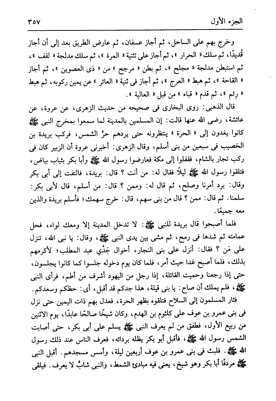 وَخرج بهم على السَّاحِل ثمَّ أجَاز عسفان ثمَّ عَارض الطَّرِيق بعد إِلَى أَن أجَاز قديداً ثمَّ سلك الْحرار ثمَّ أجَاز على تَثْنِيَة الْمرة ثمَّ سلك مُدْلِجَة لقف ثمَّ استبطن مُدْلِجَة مجلح ثمَّ بطن مُرَجّح من ذِي العصوين ثمَّ أجَاز القاحة ثمَّ هَبَط العرج ثمَّ أجَاز فِي ثنية العائر عَن يَمِين ركُوبه ثمَّ هَبَط رئم ثمَّ قدم قبَاء من قبل الْعَالِيَة قَالَ الذَّهَبِيّ روى البُخَارِيّ فِي صَحِيحه من حَدِيث الزُّهْرِيّ عَن عُرْوَة عَن عَائِشَة رَضِي الله عَنْهَا قَالَت إِن الْمُسلمين بِالْمَدِينَةِ لما سمعُوا بمخرج النَّبِي