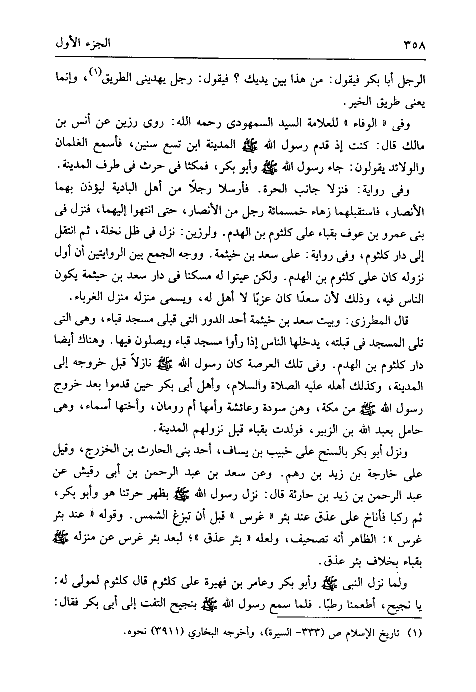الرجل أَبَا بكر فَيَقُول من هَذَا بَين يَديك فَيَقُول رجل يهديني الطَّرِيق وَإِنَّمَا يَعْنِي طَرِيق الْخَيْر وَفِي الْوَفَاء للعلامة السَّيِّد السمهودي رَحمَه الله روى رزين عَن أنس بن مَالك قَالَ كنت إِذْ قدم رَسُول الله