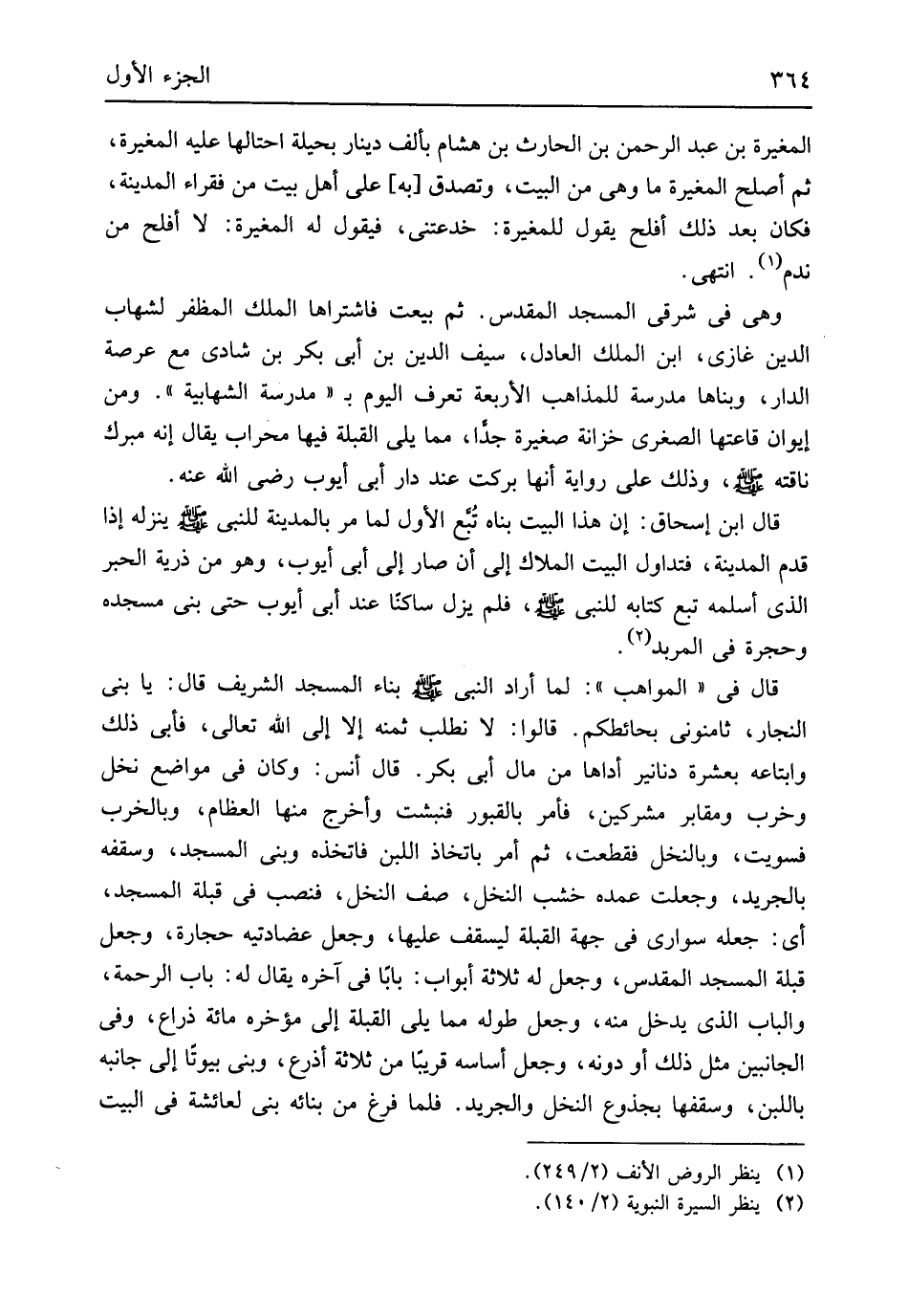 بِنَاء الْمَسْجِد الشريف قَالَ يَا بني النجار ثامنوني بحائطكم قَالُوا لَا نطلب ثمنه إِلَّا إِلَى الله تَعَالَى فَأبى ذَلِك واتباعه بِعشْرَة دَنَانِير أَدَّاهَا من مَال أبي بكر قَالَ أنس وَكَانَ فِي مَوَاضِع نخل وَخرب ومقابر مُشْرِكين فَأمر بالقبور فنبشت وَأخرج مِنْهَا الْعِظَام وبالخرب فسويت وبالنخل فَقطعت ثمَّ أَمر باتخاذ اللَّبن فاتخذه وَبنى الْمَسْجِد وسقفه بِالْجَرِيدِ وَجعلت عمده خشب النّخل صف النّخل فنصب فِي قبْلَة الْمَسْجِد أَي جعله سواري فِي جِهَة الْقبْلَة ليسقف عَلَيْهَا وَجعل عضادتيه حِجَارَة وَجعل قبْلَة الْمَسْجِد الْمُقَدّس وَجعل لَهُ ثَلَاثَة أَبْوَاب بَابا فِي آخِره يُقَال لَهُ بَاب الرَّحْمَة وَالْبَاب الَّذِي يدْخل مِنْهُ وَجعل طوله مِمَّا يَلِي الْقبْلَة إِلَى مؤخره مائَة ذِرَاع وَفِي الْجَانِبَيْنِ مثل ذَلِك أَو دونه وَجعل أساسه قَرِيبا من ثَلَاثَة أَذْرع وَبنى بُيُوتًا إِلَى جَانِبه بِاللَّبنِ وسقفها بجذوع النّخل والجريد فَلَمَّا فرغ من بنائِهِ بنى لعَائِشَة فِي الْبَيْت