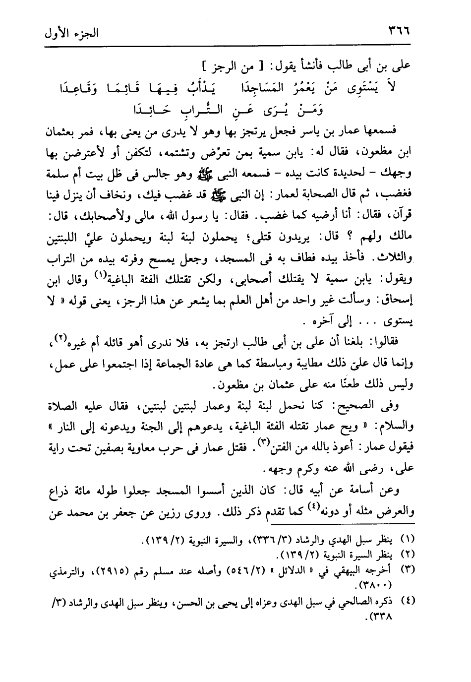 قد غضب فِيك ونخاف أَن ينزل فِينَا قُرْآن فَقَالَ أَنا أرضيه كَمَا غضب فَقَالَ يَا رَسُول الله مَالِي ولأصحابك قَالَ مَالك وَلَهُم قَالَ يُرِيدُونَ قَتْلِي يحملون لبنة لبنة ويحملون عَليّ اللبنتين وَالثَّلَاث فَأخذ بِيَدِهِ فَطَافَ بِهِ فِي الْمَسْجِد وَجعل يمسح وفرته بِيَدِهِ من التُّرَاب وَيَقُول ياابن سميَّة لَا يقتلك أَصْحَابِي وَلَكِن تقتلك الفئة الباغية وَقَالَ ابْن إِسْحَاق وَسَأَلت غير وَاحِد من أهل الْعلم بِمَا يشْعر عَن هَذَا الرجز يَعْنِي قَوْله لَا يَسْتَوِي إِلَى آخِره فَقَالُوا بلغنَا أَن عَليّ بن أبي طَالب ارتجز بِهِ فَلَا نَدْرِي أهوَ قَائِله أم غَيره وَإِنَّمَا قَالَ عَليّ ذَلِك مطايبة ومباسطة كَمَا هِيَ عَادَة الْجُمُعَة إِذا اجْتَمعُوا على عمل وَلَيْسَ ذَلِك طَعنا مِنْهُ على عُثْمَان بن مَظْعُون وَفِي الصَّحِيح كُنَّا نحمل لبنة لبنة وعمار لبنتين لبنتين فَقَالَ عَلَيْهِ الصَّلَاة وَالسَّلَام وَيْح عمار تقلته الفئة الباغية يَدعُوهُم إِلَى الْجنَّة ويدعونه إِلَى النَّار فَيَقُول عمار أعوذ بِاللَّه من الْفِتَن فَقتل عمار فِي حَرْب مُعَاوِيَة بصفين تَحت راية عَليّ رَضِي الله عَنهُ وكرم الله وَجهه وَعَن أُسَامَة عَن أَبِيه قَالَ كَانَ الَّذِي أسسوا الْمَسْجِد جعلُوا طوله مائَة ذِرَاع وَالْعرض مثله أَو دونه كَمَا تقدم ذكر ذَلِك وروى رزين عَن جَعْفَر بن مُحَمَّد عَن