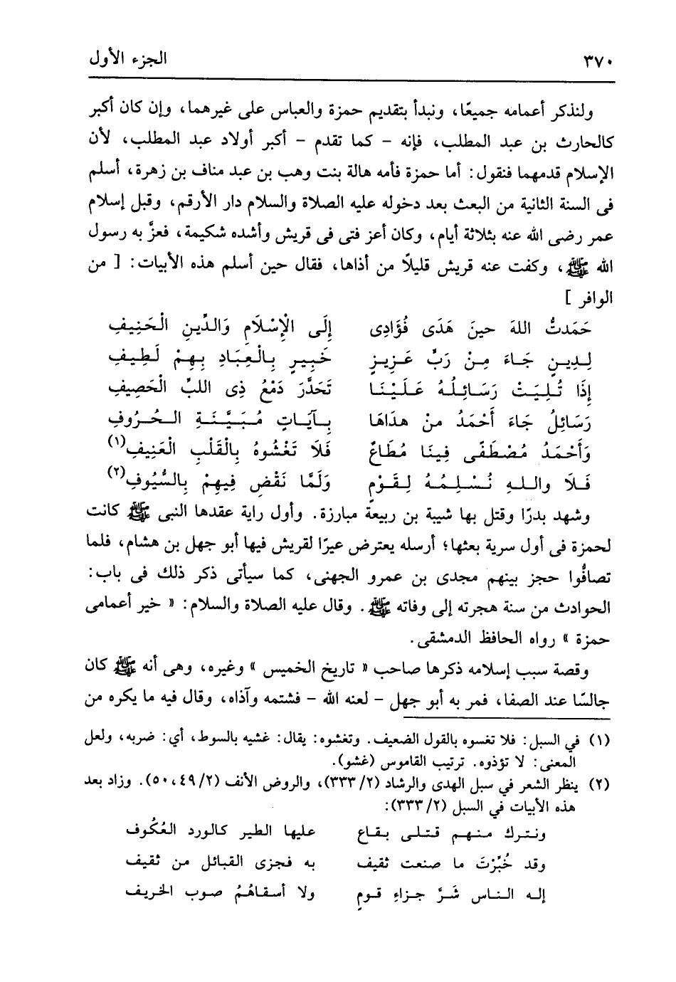 ولنذكر أَعْمَامه جَمِيعًا ونبدأ بِتَقْدِيم حَمْزَة وَالْعَبَّاس على غَيرهمَا وَإِن كَانَ أكبر كالحارث بن عبد الْمطلب فَإِنَّهُ كَمَا تقدم أكبر أَوْلَاد عبد الْمطلب لِأَن الْإِسْلَام قدمهما فَنَقُول أما حَمْزَة فأمه هَالة بنت وهب بن عبد منَاف بن زهرَة أسلم فِي السّنة الثَّانِيَة من الْبَعْث بعد دُخُوله عَلَيْهِ الصَّلَاة وَالسَّلَام دَار الأرقم وَقبل إِسْلَام عمر رَضِي الله عَنهُ بِثَلَاثَة أَيَّام وَكَانَ أعز فَتى فِي قُرَيْش وأشده شكيمة فعز بِهِ رَسُول الله