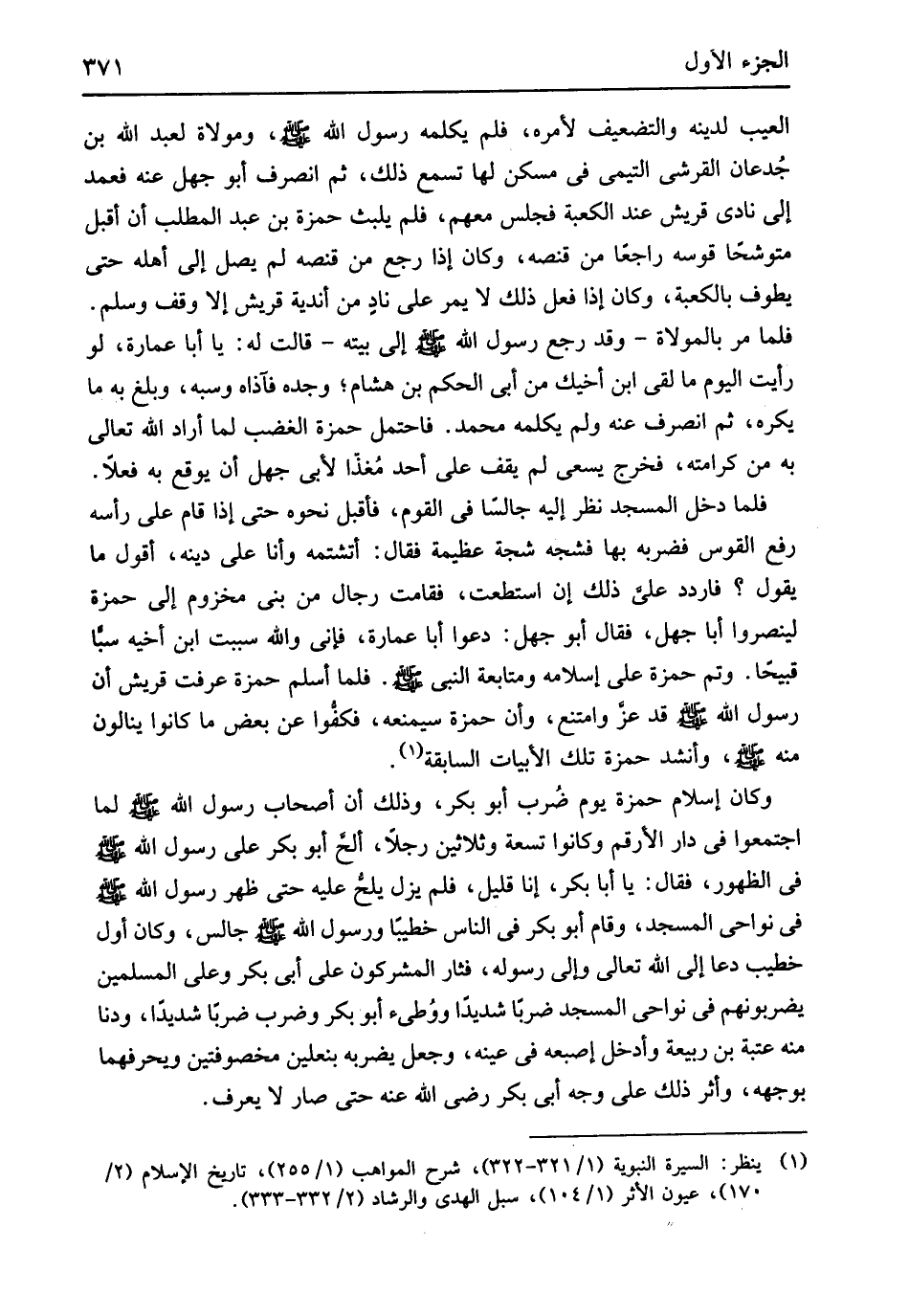 وَأنْشد حَمْزَة تِلْكَ الأبيات السَّابِقَة وَكَانَ إِسْلَام حَمْزَة يَوْم ضرب أَبُو بكر وَذَلِكَ أَن اصحاب رَسُول الله