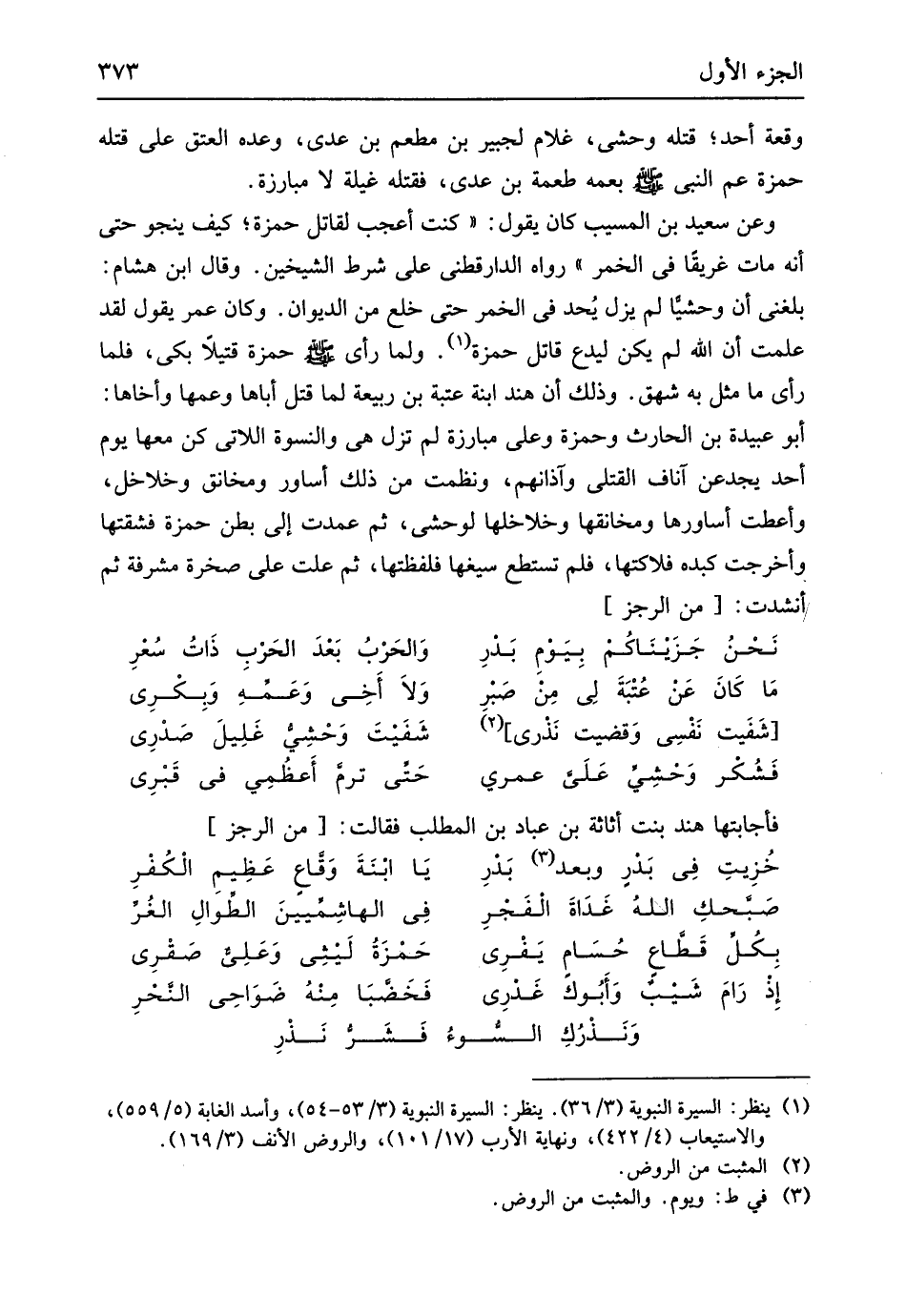حَمْزَة قَتِيلا بَكَى فَلَمَّا رأى مَا مثل بِهِ شهق وَذَلِكَ أَن هِنْد ابْنة عتبَة بن ربيعَة لما قتل أَبَاهَا وعمها وأخاها أَبُو عُبَيْدَة بن الْحَارِث وَحَمْزَة وَعلي مبارزة لم تزل هِيَ والنسوة اللَّاتِي كن مَعهَا يَوْم أحد يجدعن آناف الْقَتْلَى وآذانهم ونظمت من ذَلِك أساور ومخانق وخلاخل وأعطت أساورها ومخانقها وخلاخلها لوحشي ثمَّ عَمَدت إِلَى بطن حَمْزَة فشقتها وأخرجت كبده فلاكتها فَلم تستطع سيغها فلفظتها ثمَّ علت على صَخْرَة مشرفة ثمَّ أنشدت // (من الرجز) //