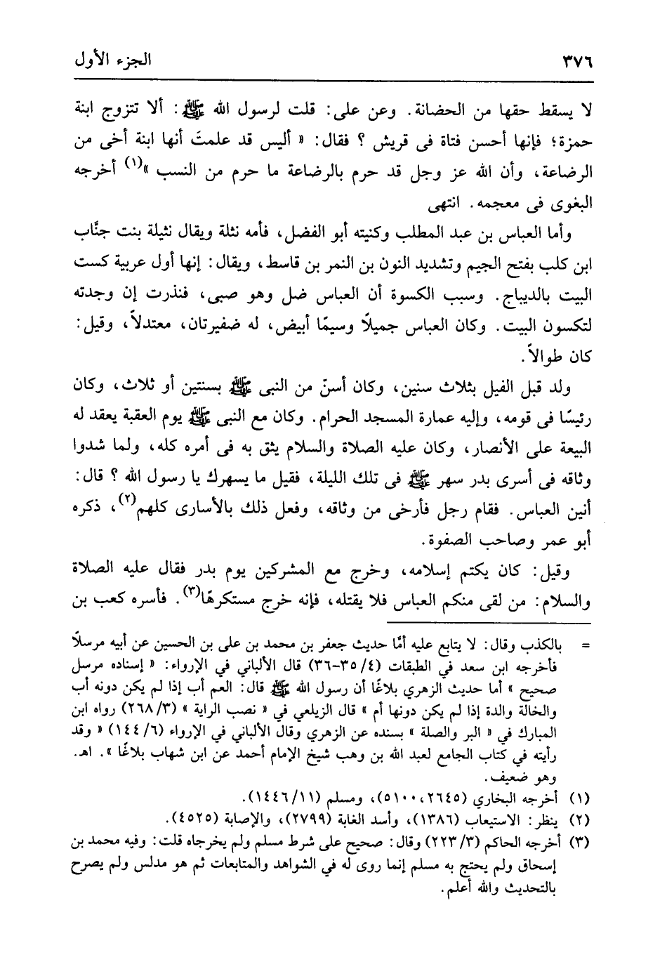 أَلا تتَزَوَّج ابْنة حَمْزَة فَإِنَّهَا أحسن فتاة فِي قُرَيْش فَقَالَ أَلَيْسَ قد علمت أَنَّهَا ابْنة أخي من الرضَاعَة وَأَن الله عز وَجل قد حرم بالرضاعة مَا حرم من النّسَب أخرجه الْبَغَوِيّ مُعْجَمه انْتهى وَأما الْعَبَّاس بن عبد الْمطلب وكنيته أَبُو الْفضل فأمه نثلة وَيُقَال نثيلة بنت جناب ابْن كلب فتح الْجِيم وَتَشْديد النُّون بن النمر بن قاسط وَيُقَال إِنَّهَا أول عَرَبِيَّة كست الْبَيْت بالديباج وَسبب الْكسْوَة أَن الْعَبَّاس ضل وَهُوَ صبي فنذرت إِن وجدته لتكسون الْبَيْت وَكَانَ الْعَبَّاس جميلاً وسيماً أَبيض لَهُ ضفيرتان معتدلاً وَقيل كَانَ طوَالًا ولد قبل الْفِيل بِثَلَاث سِنِين وَكَانَ اسن من النَّبِي