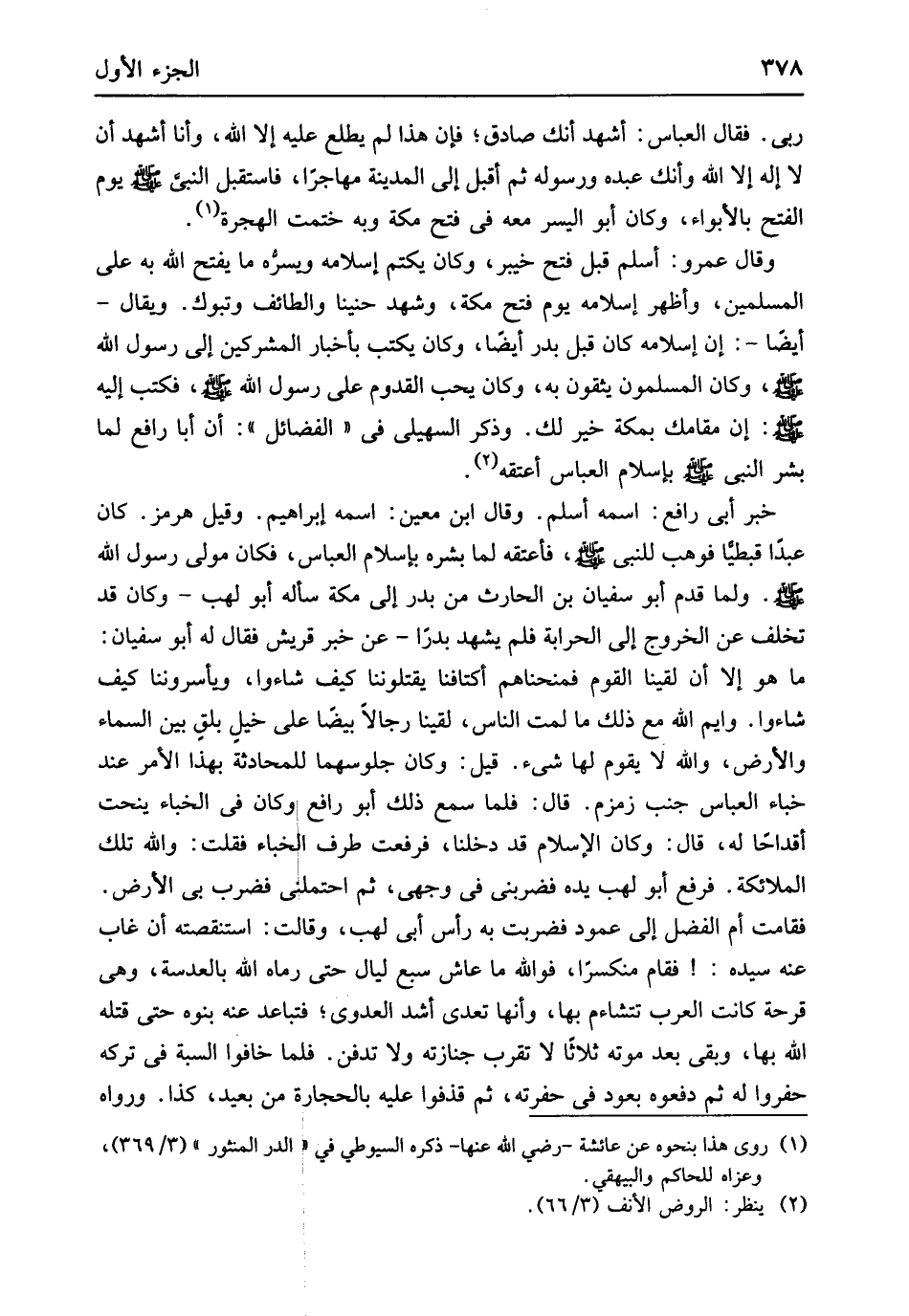 وَلما قدم أَبُو سُفْيَان بن الْحَارِث من بدر إِلَى مَكَّة سَأَلَهُ أَبُو لَهب وَكَانَ قد تخلف عَن الْخُرُوج إِلَى الْحِرَابَة فَلم يشْهد بَدْرًا عَن خبر قُرَيْش فَقَالَ لَهُ أَبُو سُفْيَان مَا هُوَ إِلَّا لَقينَا الْقَوْم فمنحناهم أكتافنا يقتلوننا كَيفَ شَاءُوا ويأسروننا كَيفَ شَاءُوا وَايْم الله مَعَ ذَلِك مَا لمت النَّاس لَقينَا رجَالًا بيضًا على خيل بلق بَين السَّمَاء وَالْأَرْض وَالله لَا يقوم لَهَا شَيْء قيل وَكَانَ جلوسهما للمحادثة بِهَذَا الْأَمر عِنْد خباء الْعَبَّاس جنب زَمْزَم قَالَ فَلَمَّا سمع ذَلِك أَبُو رَافع وَكَانَ فِي الخباء ينحت أقداحاً لَهُ قَالَ وَكَانَ الْإِسْلَام قد دَخَلنَا فَرفعت طرف الخباء فَقلت وَالله تِلْكَ الْمَلَائِكَة فَرفع أَبُو لَهب يَده فضربني فِي وَجْهي ثمَّ احتملني فَضرب بِي الأَرْض فَقَامَتْ أم الْفضل إِلَى عَمُود فَضربت بِهِ رَأس أبي لَهب وَقَالَت استنقصته أَن غَابَ عَنهُ سَيّده فَقَامَ منكسراً فوَاللَّه مَا عَاشَ سبع لَيَال حَتَّى رَمَاه الله بالعدسة وَهِي قرحَة كَانَت الْعَرَب تتشاءم بهَا وَأَنَّهَا تعدى أَشد الْعَدْوى فتباعد عَنهُ بنوه حَتَّى قَتله الله بهَا وَبَقِي بعد مَوته ثَلَاثًا لَا تقرب جنَازَته وَلَا تدفن فَلَمَّا خَافُوا السبة فِي تَركه حفروا لَهُ ثمَّ دفعوه بِعُود فِي حفرته ثمَّ قذفوا عَلَيْهِ بِالْحِجَارَةِ من بعيد كَذَا وَرَوَاهُ