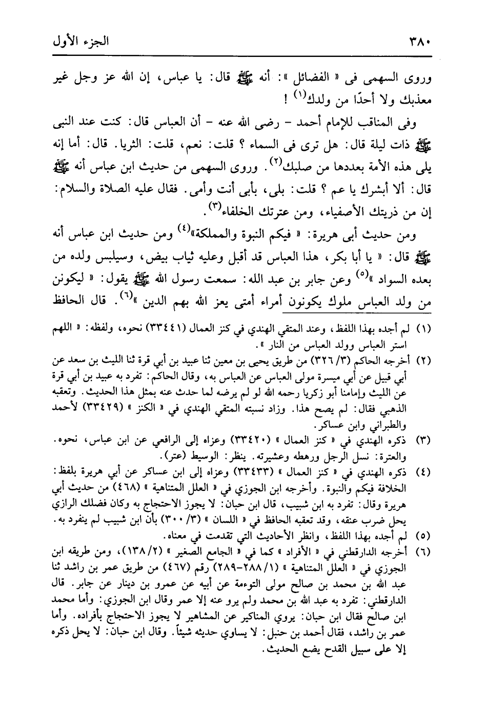 قَالَ يَا عَبَّاس إِن الله عز وَجل غير معذبك وَلَا أحدا من ولدك وَفِي المناقب للْإِمَام أَحْمد رَضِي الله عَنهُ أَن الْعَبَّاس قَالَ كنت عِنْد النَّبِي