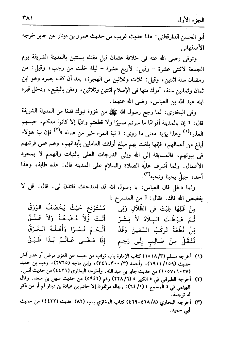 أَبُو الْحسن الدَّارَقُطْنِيّ هَذَا حَدِيث غَرِيب من حَدِيث عَمْرو بن دِينَار عَن جَابر خرجه الْأَصْفَهَانِي وَتُوفِّي رَضِي الله عَنهُ فِي خلَافَة عُثْمَان قبل مَقْتَله بِسنتَيْنِ بِالْمَدِينَةِ الشَّرِيفَة يَوْم الْجُمُعَة لِاثْنَتَيْ عشرَة وَقيل لأَرْبَع عشرَة لَيْلَة خلت من رَجَب وَقيل من رَمَضَان سنة اثْنَتَيْنِ وَقيل ثَلَاث وَثَلَاثِينَ من الْهِجْرَة بعد أَن كف بَصَره وَهُوَ ابْن ثَمَان وَثَمَانِينَ سنة أدْرك مِنْهَا فِي الْإِسْلَام اثْنَتَيْنِ وَثَلَاثِينَ وَدفن بِالبَقِيعِ وَدخل قَبره ابْنه عبد الله بن الْعَبَّاس رَضِي الله عَنْهُمَا وَفِي البُخَارِيّ لما رَجَعَ رَسُول الله