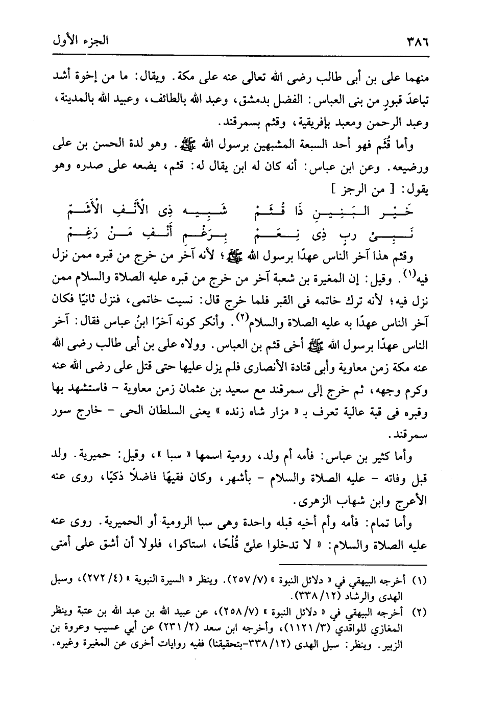 مِنْهُمَا عَليّ بن أبي طَالب رَضِي الله تَعَالَى عَنهُ على مَكَّة وَيُقَال لمن من إخْوَة أَشد تبَاعد قُبُور من بني الْعَبَّاس الْفضل بِدِمَشْق وَعبد الله بِالطَّائِف وَعبيد الله بِالْمَدِينَةِ وَعبد الرَّحْمَن ومعبد بإفريقية وَقثم بسمرقند وَأما قثم فَهُوَ أحد السَّبْعَة المشبهين برَسُول الله