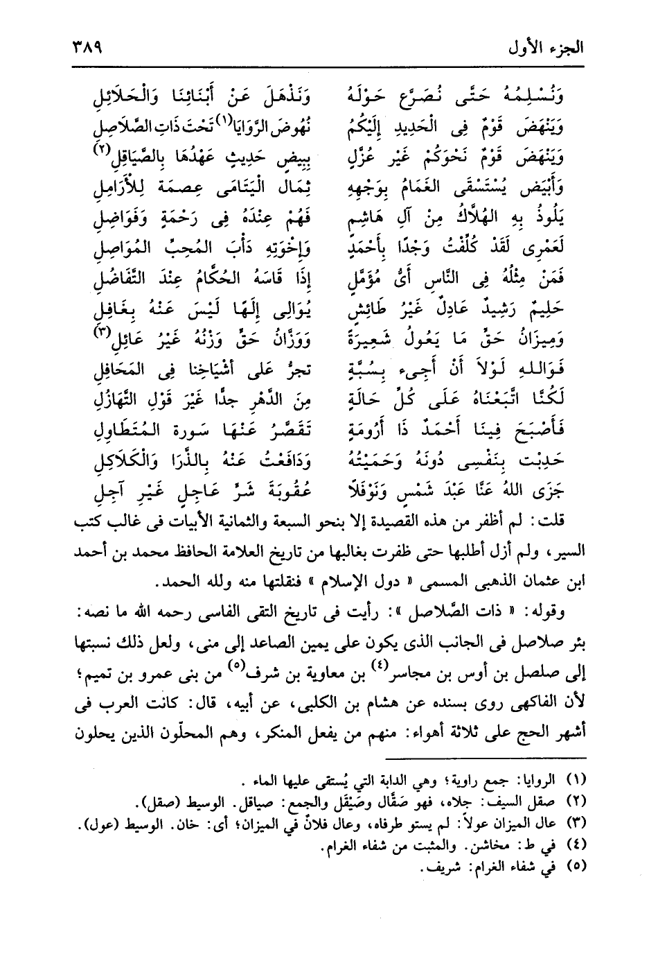 قلت لم أظفر من هَذِه القصيدة إِلَّا بِنَحْوِ السَّبْعَة وَالثَّمَانِيَة الأبيات فِي غَالب كتب السّير وَلم أزل أطلبها حَتَّى ظَفرت بغالبها من تَارِيخ الْعَلامَة الْحَافِظ مُحَمَّد بن أَحْمد ابْن عُثْمَان الذَّهَبِيّ الْمُسَمّى دوَل الْإِسْلَام فنقلتها مِنْهُ وَللَّه الْحَمد وَقَوله ذَات الصلاصل رَأَيْت فِي تَارِيخ التقي الفاسي رَحمَه الله مَا نَصه بِئْر صلاصل فِي الْجَانِب الَّذِي يكون على يَمِين الصاعد إِلَى منى وَلَعَلَّ ذَلِك نسبتها إِلَى صلصل بن أَوْس بن مجاسر بن مُعَاوِيَة بن شرف من بني عَمْرو بن تَمِيم لِأَن الفاكهي روى بِسَنَدِهِ عَن هِشَام بن الْكَلْبِيّ عَن أَبِيه قَالَ كَانَت الْعَرَب فِي أشهر الْحَج على ثَلَاثَة أهواء مِنْهُم من يفعل الْمُنكر وهم المحلون الَّذِي يحلونَ